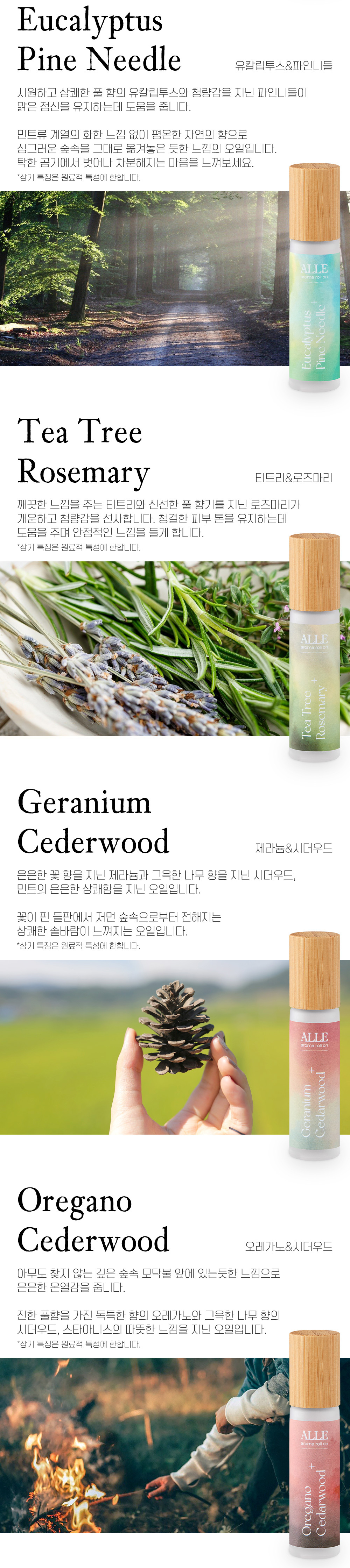 - Eucalyptus & Pine Needle: The cool and refreshing grassy scent of eucalyptus and the refreshing scent of pine needles help maintain a clear mind. It is an oil that feels like a fresh forest with a calm natural scent without the harsh feeling of the mint family. Feel your mind calming down as you escape the murky air.