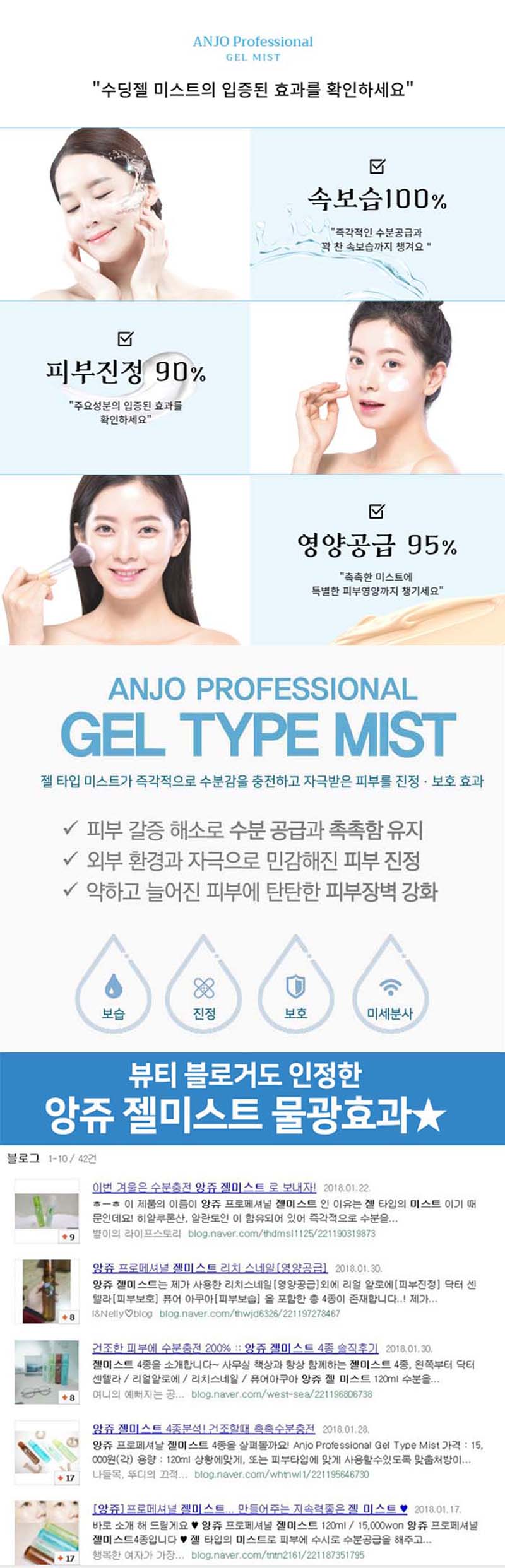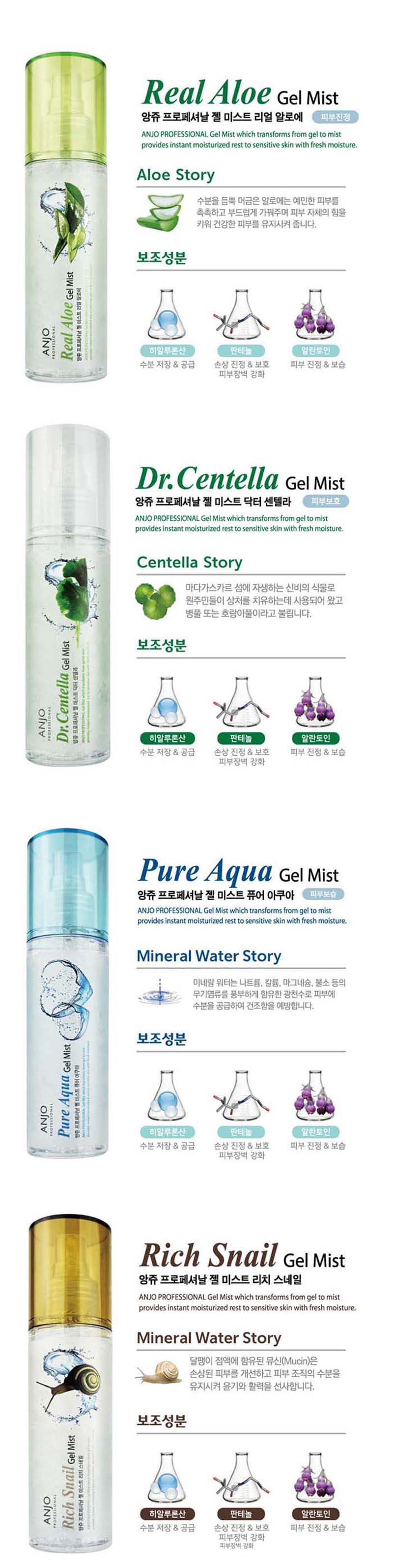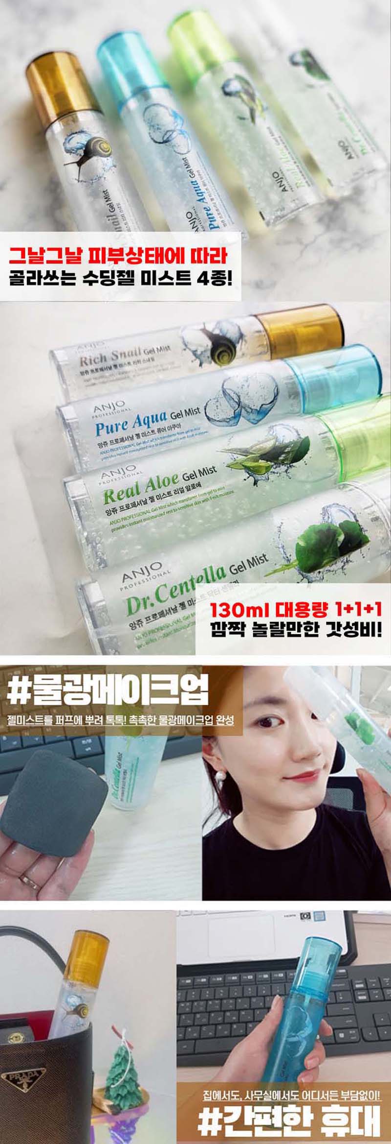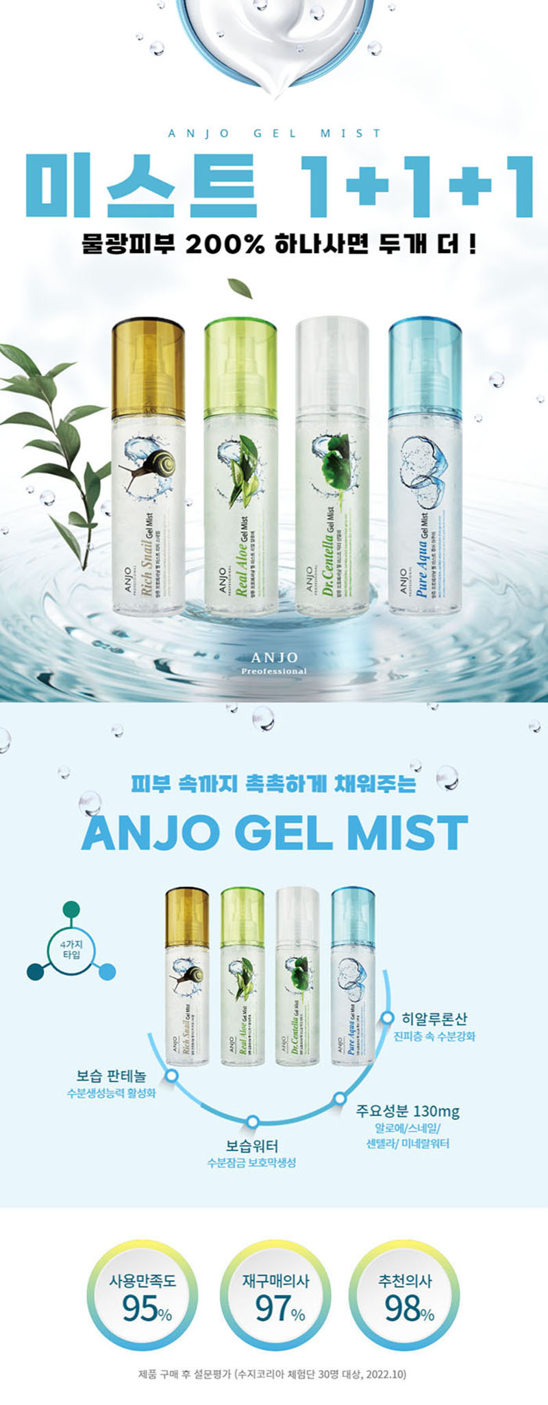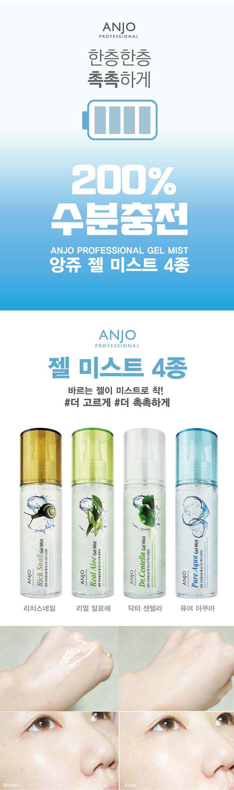 Experience the innovative ANJO Professional Gel Mist, which features a rich, moisture-packed gel-type texture that transforms into a fine mist upon spraying. This unique formula adheres thinly and evenly to the skin, providing long-lasting moisture and a glowing finish without any stickiness. It is designed to instantly relieve skin thirst while cooling and soothing sensitive skin irritated by UV rays, pollution, or dermatological treatments.