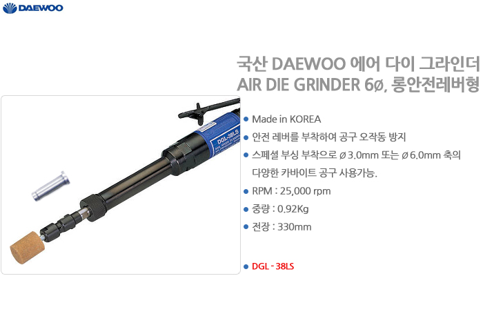 DAEWOO_Tools AIR DIE GRINDER DGL-38LS, Safety Lever Type, 25,000 rpm, Total Length 330mm