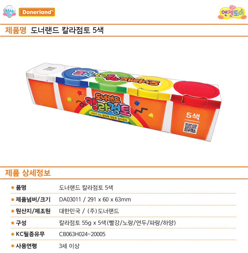 Made primarily from wheat flour, this clay is soft, pliable, and safe for young creators. This 5-color set offers a vibrant palette that can be easily mixed to create new shades, helping children enrich their sense of color and EQ (Emotional Quotient). It’s an ideal educational tool for sensory play, allowing kids to squish, mold, and shape their imagination into reality. As it is a natural wheat-based dough, it air-dries naturally over time. Experience the trusted quality of Korea’s leading clay brand, Donerland, which prioritizes children's safety with KC certification.
