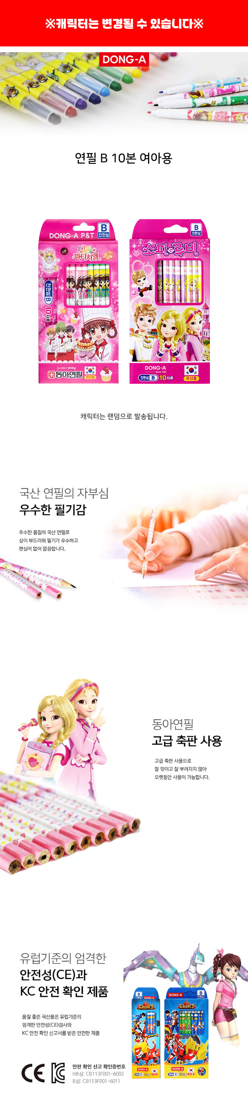 DONG-A Character Pencils for girls are high-quality writing instruments featuring enchanting designs like "SofyRuby" and "Patissiere." These pencils use advanced bonding technology to ensure the lead is perfectly centered and highly resistant to breakage, even during frequent sharpening. Available in HB and B hardness, the soft graphite provides a smooth, effortless glide on paper. Certified safe by CE and KC, these pink-themed pencils are the ideal choice for school and home, supporting your child's developing handwriting with reliable Korean quality.