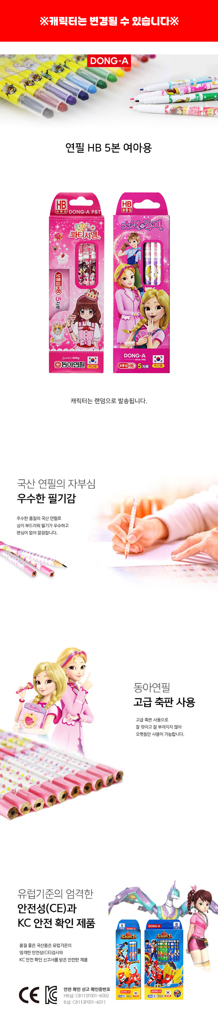 DONG-A Character Pencils for girls feature enchanting designs like "SofyRuby" and "Patissiere." These pencils use advanced bonding technology to ensure the lead is perfectly centered, preventing off-center sharpening and breakage. Available in HB and B hardness, the soft graphite provides a smooth, effortless glide on paper, perfect for small hands. Certified safe by CE and KC, this 5-piece set is the ideal portable choice for school and home.