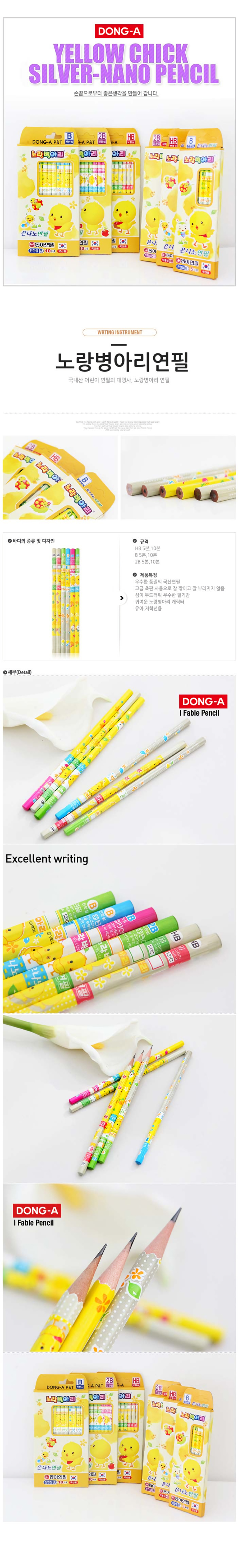 DONG-A Yellow Chick Pencils are high-quality writing instruments specifically crafted for toddlers and elementary school students. Featuring the beloved Yellow Chick character, these pencils make learning fun and engaging. Available in HB, B, and 2B, they use advanced graphite technology to ensure the lead is soft yet incredibly strong against breakage. Proudly made in Korea, these pencils provide a comfortable grip and a smooth flow, helping children develop proper writing habits with ease and joy.