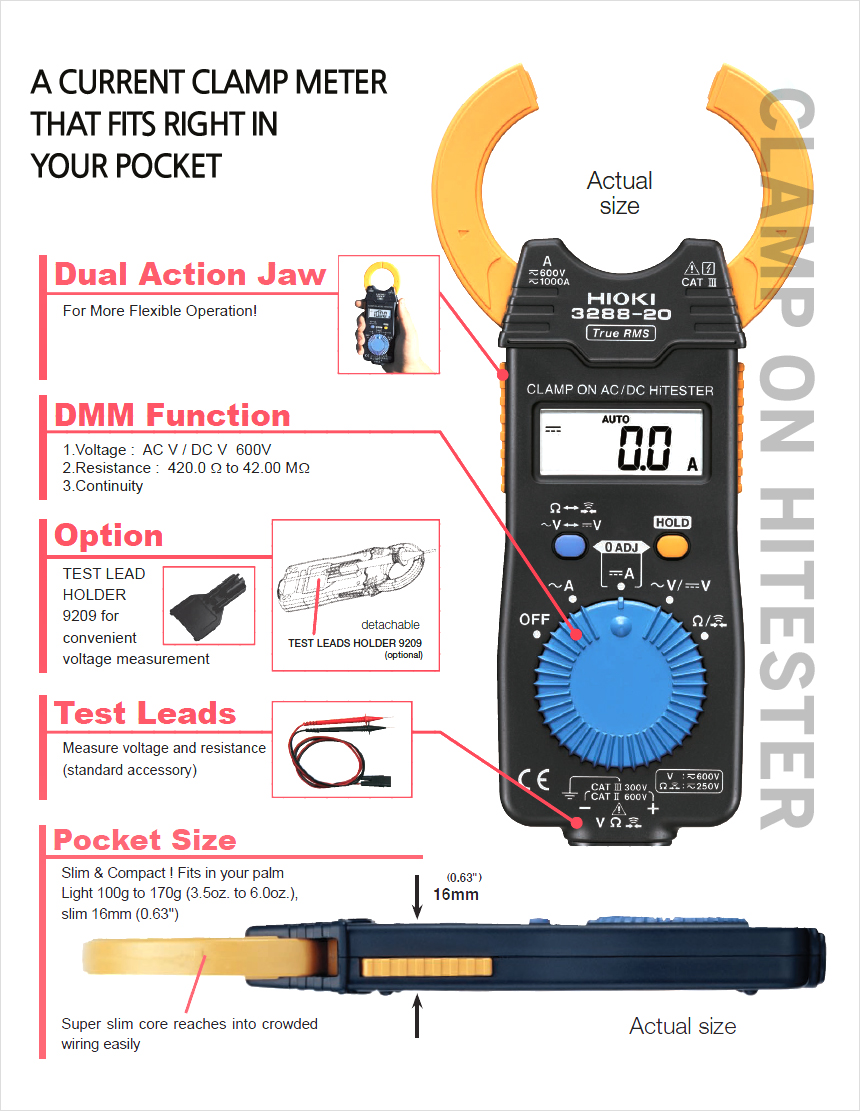 The Hioki 3287 is an AC/DC current and voltage clamp meter that also measures continuity and resistance, featuring a double jaw lever and slim profile for easy access to crowded wires.