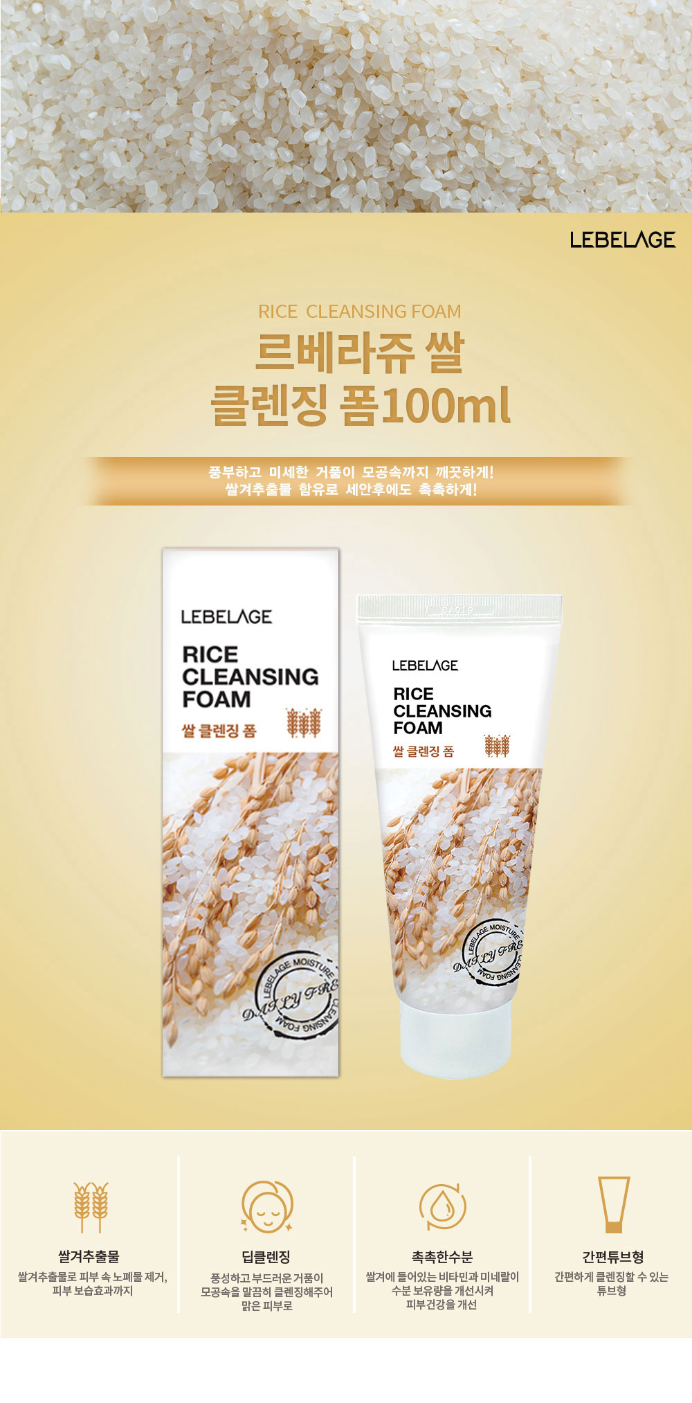 LEBELAGE Rice Cleansing Foam 100ml Brightening and Hydrating Face Wash with Rice Bran Extract for Deep Pore Cleansing _ Made in Korea