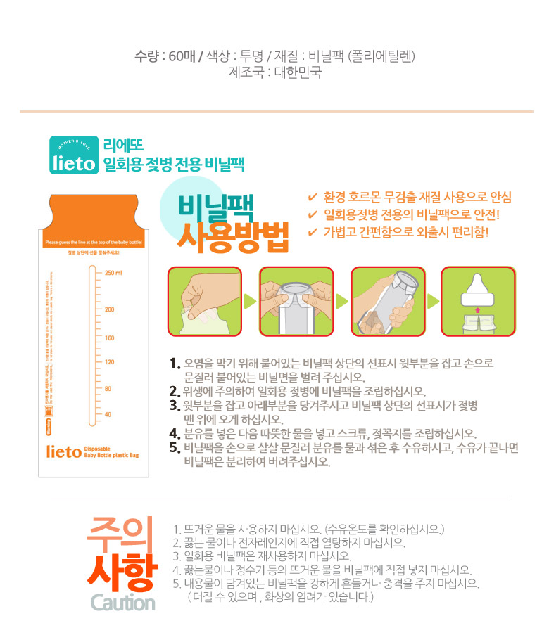 [Lieto_Baby]Lieto Disposable Baby Bottle Plastic Pack 60 sheets_Environmental hormone-free material_Made in KOREA