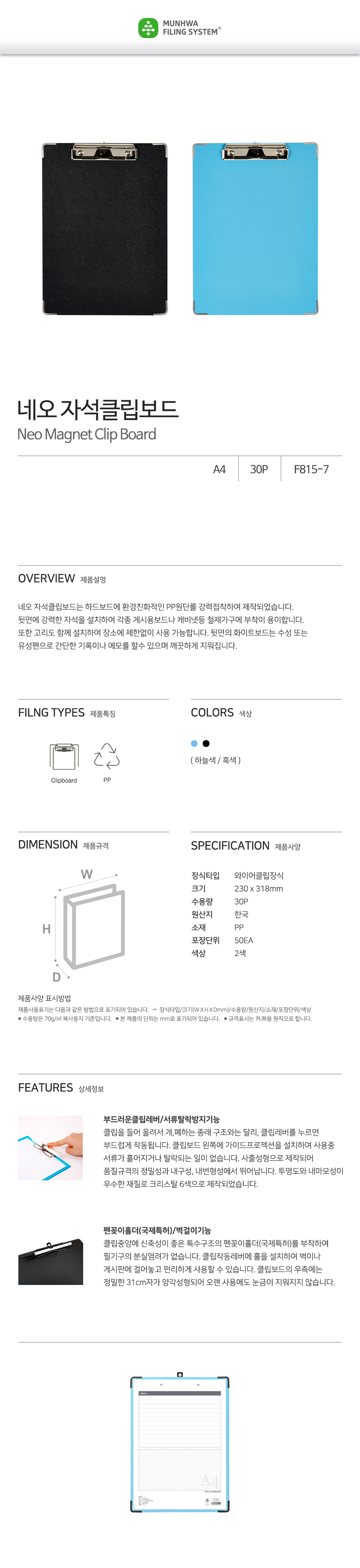 The Munhwa File Magnetic Neo Clipboard is an advanced organizational tool featuring powerful rear magnets, allowing it to attach effortlessly to metal cabinets, refrigerators, or whiteboards. Crafted with eco-friendly PP material, this multi-functional board includes a writable whiteboard backing and a unique side guide projection to keep documents aligned. It is the perfect solution for factory floors, kitchens, or offices where hands-free document display and instant memo-taking are essential.