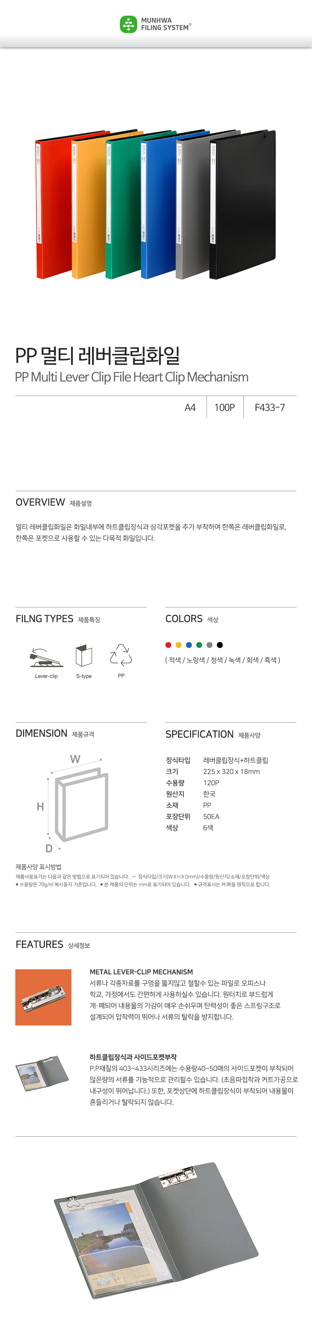 Munhwa Multi Lever-Clip Punchless File F433-7 | A4 | Left-Side Heart Clip & Side Pocket | 6 Color Options | No-Hole Binding | Made in Korea