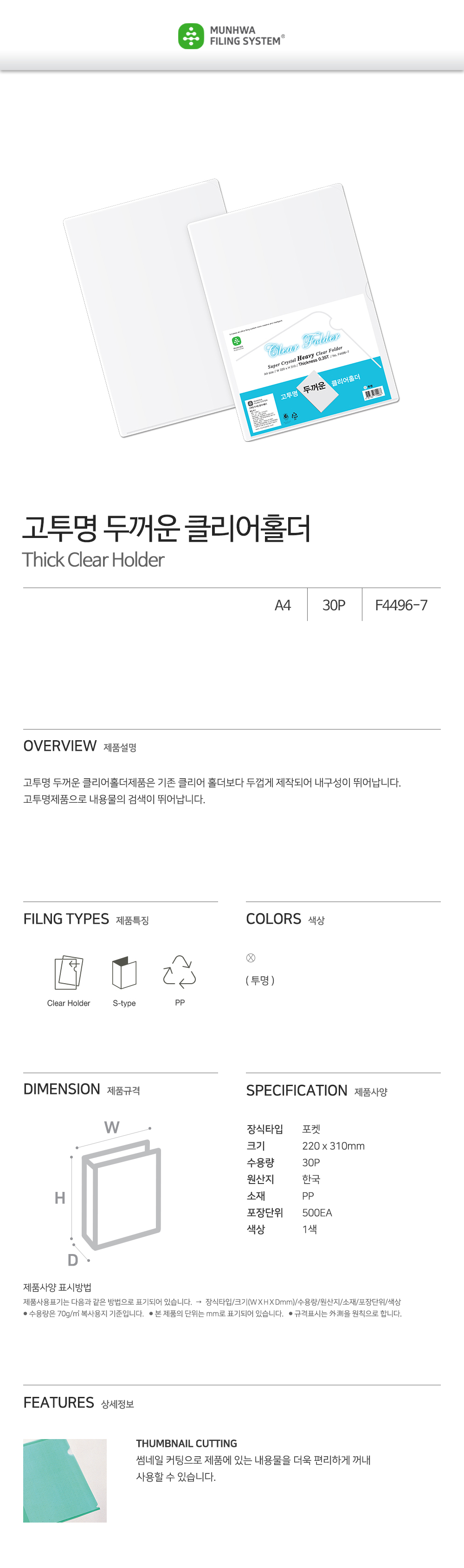 The Munhwa F4496-7 is a professional-grade archival tool designed for those who require more than a standard folder. Engineered with an extra-thick 0.35mm Polypropylene (PP) sheet, this holder offers significantly higher rigidity and impact resistance than conventional 0.15mm or 0.2mm versions. The premium High-Transparency finish ensures that your documents are presented with crystal-clear visibility, making it ideal for important contracts, blueprints, and high-end sales materials that need to remain flat and protected from creases and environmental damage.