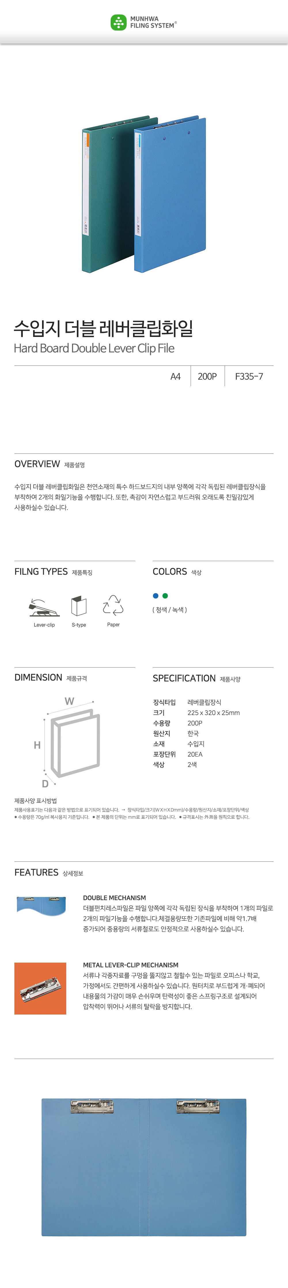 The Munhwa F335-71 combines the tactile warmth of premium imported specialty hardboard with a highly efficient Double Mechanism. This file is equipped with two independent metal lever clips on both sides of the interior, allowing it to function as two folders in one. Crafted from natural materials, the cover offers a soft, premium feel that is more sustainable and professional than standard plastic. It is the perfect solution for organizing up to 200 sheets of original documents, such as legal contracts and design proposals, without the need for a hole punch.