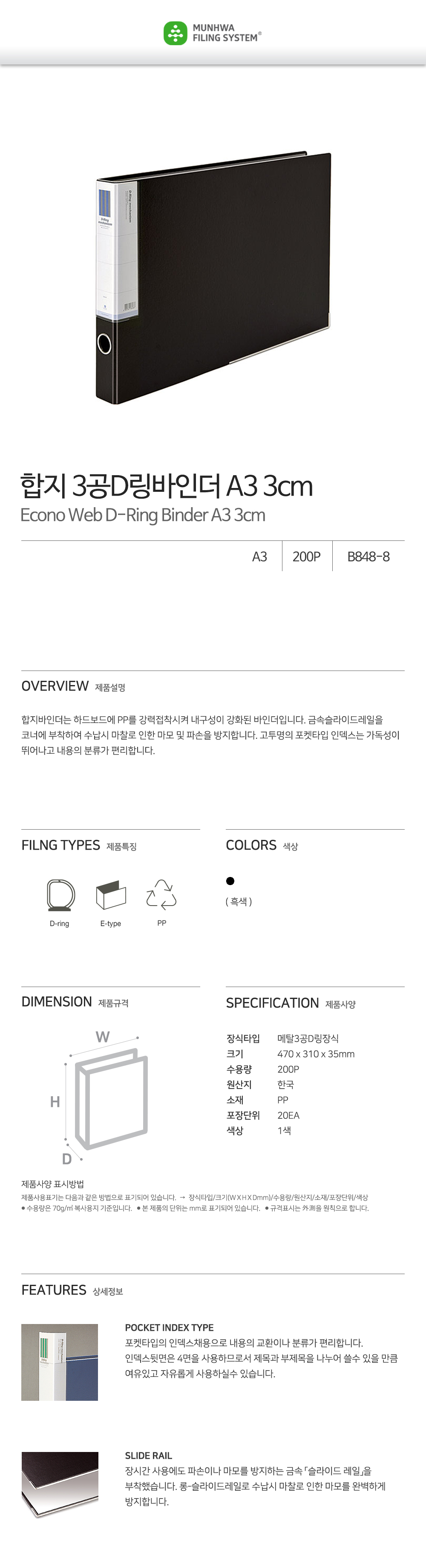 The Munhwa B848-8 is a slim-profile, high-durability binder specifically designed for A3-sized documents such as architectural blueprints, design portfolios, and large spreadsheets. Constructed by bonding premium Polypropylene (PP) to a rigid hardboard core, it provides superior structural integrity for large-format storage. This model is equipped with specialized metal "Slide Rails" on the bottom corners to eliminate wear and tear caused by shelf friction, ensuring your professional documents are preserved in a sleek, organized manner.