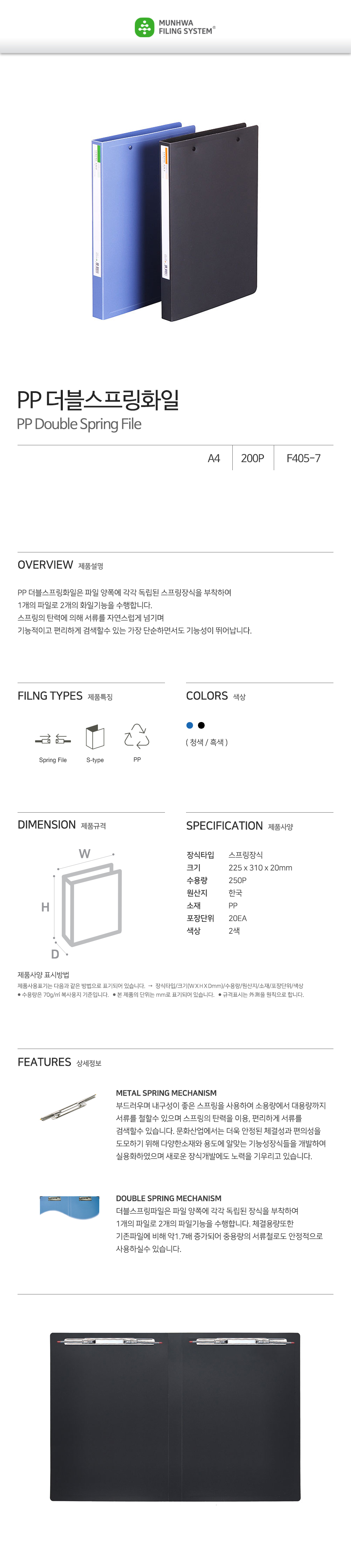 The Munhwa F405-72 is a versatile, high-capacity organizational tool designed to function as two files in one. By incorporating Double Spring Mechanisms—independent metal springs on both the left and right sides of the interior—this file allows you to manage two separate document sets within a single sleek folder. Crafted from durable Polypropylene (PP), it utilizes high-tension metal springs that allow for smooth page-turning and effortless document searching. With a combined capacity of up to 250 sheets, it is the ultimate solution for medium-to-large volume records.