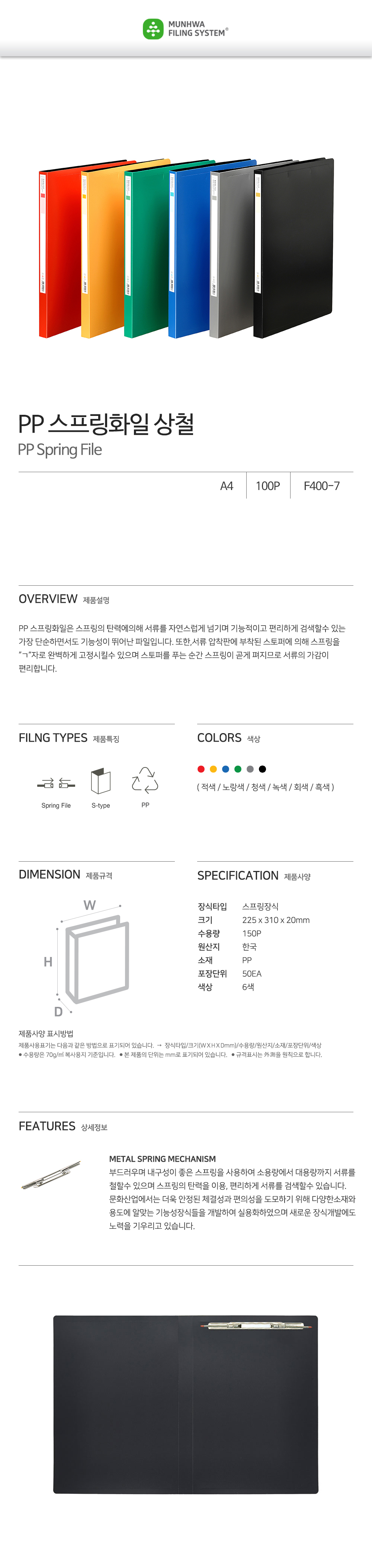 The Munhwa F420-7 is a highly functional and durable filing solution designed for quick access and secure document management. This Top-Bind (Landscape opening) model uses the natural elasticity of a high-quality metal spring to allow users to flip through documents smoothly and find information at a glance. Equipped with a specialized "L-Shape" Stopper system, the spring can be locked firmly to keep documents compressed or released instantly for adding and removing sheets, making it the perfect choice for frequently updated records.