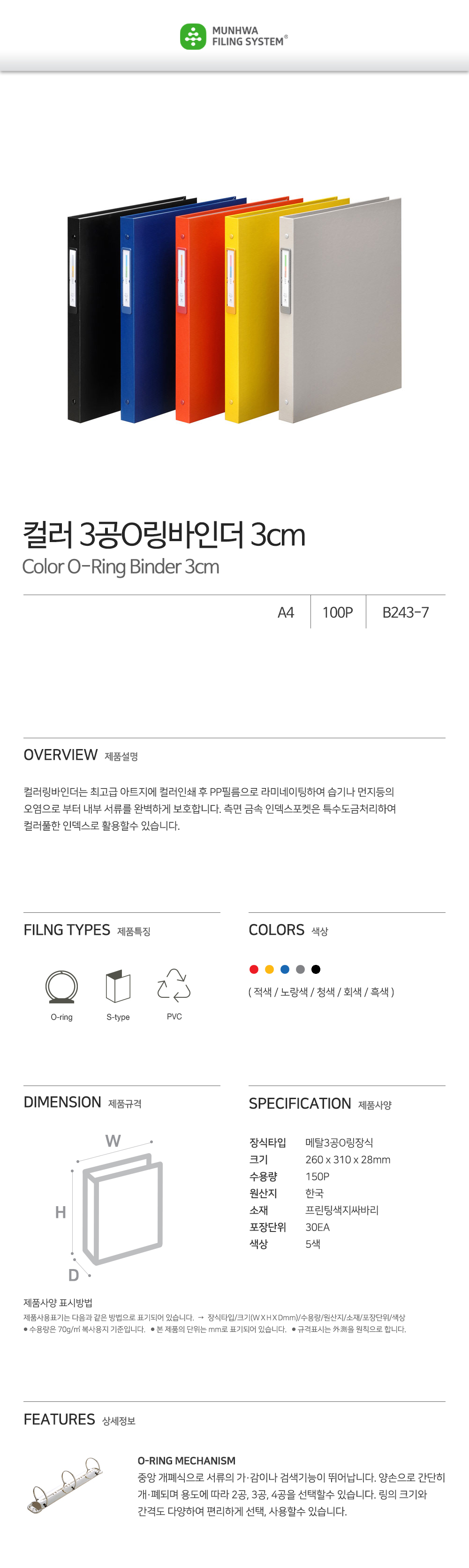 The Munhwa B243-7 Color Ring Binder is a stylish yet highly durable organizational solution crafted by laminating high-grade art paper with a protective PP (Polypropylene) film. Available in five distinct colors, this binder allows for efficient color-coded filing while providing a perfect barrier against moisture, dust, and daily wear. Featuring a sophisticated metal index pocket on the spine and a smooth O-ring mechanism, it is the ideal choice for school presentations, office reports, and professional archiving.