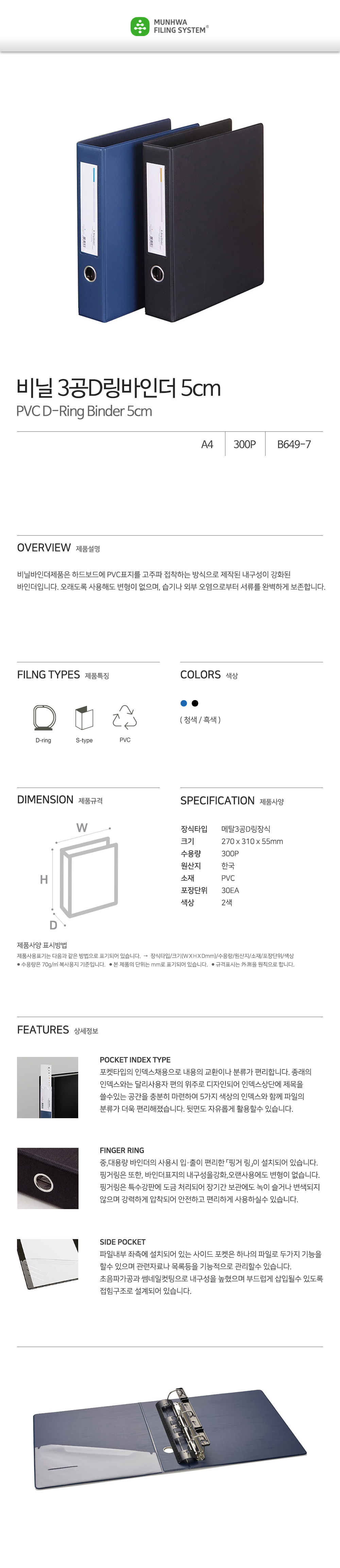 The Munhwa B649-7 is a high-performance office binder featuring a premium PVC cover fused to a rigid hardboard core through high-frequency welding. This industrial-grade construction ensures a complete shield against moisture, dust, and contaminants while preventing warping even after long-term use. Optimized for corporate environments, it includes a robust 1.5-inch D-ring mechanism, a rust-resistant spine finger ring, and an internal side pocket designed for efficient multi-functional document storage.