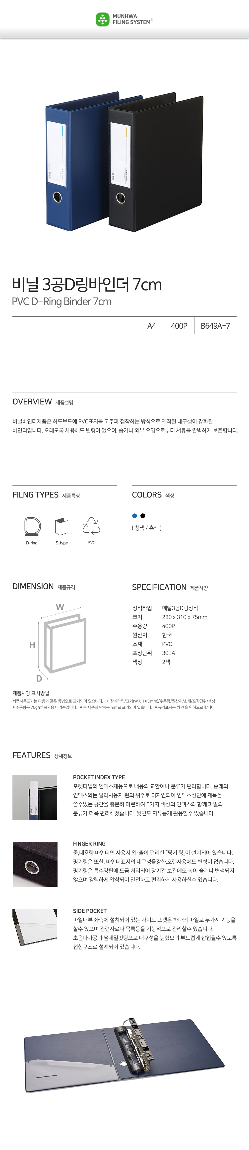 The Munhwa B649A-71 is a professional-grade binder constructed by high-frequency welding premium PVC covers over a rigid hardboard core. This advanced manufacturing process ensures that the binder remains free from deformation even after years of use, providing a perfect shield against moisture and external contaminants. Designed for high-capacity archiving, it features a 2-inch D-ring mechanism, a rust-resistant spine finger ring, and a functional internal side pocket for maximum organizational efficiency.