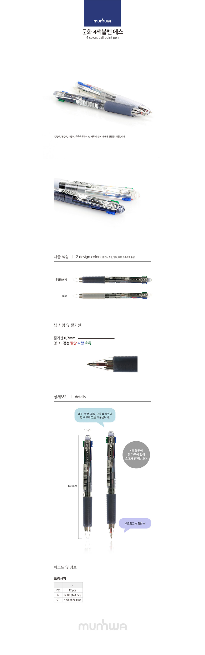 The MUNHWA S-4 multi-color pen combines Black, Blue, Red, and Green inks into a single, reliable body. Designed for those who need to organize information quickly, its 0.7mm tips deliver a consistent and vivid writing experience. The transparent blue body allows you to monitor ink levels at a glance, while the soft white rubber grip ensures comfort during long hours of use. Lightweight yet durable, this pen is an essential tool for office workers, students, and teachers. Proudly made in Korea.