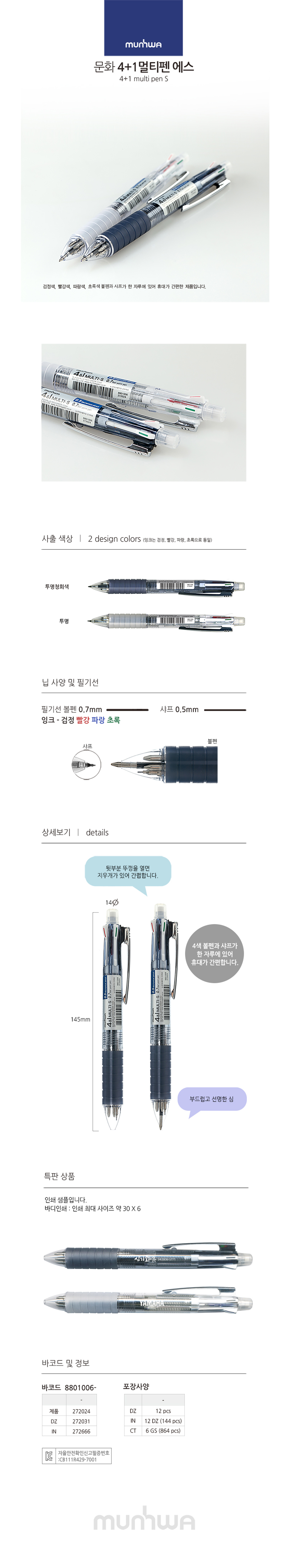 MUNHWA S-Multi 4&1 Pen | 4-Color Ballpoint 0.7mm + 0.5mm Mechanical Pencil | Made in Korea