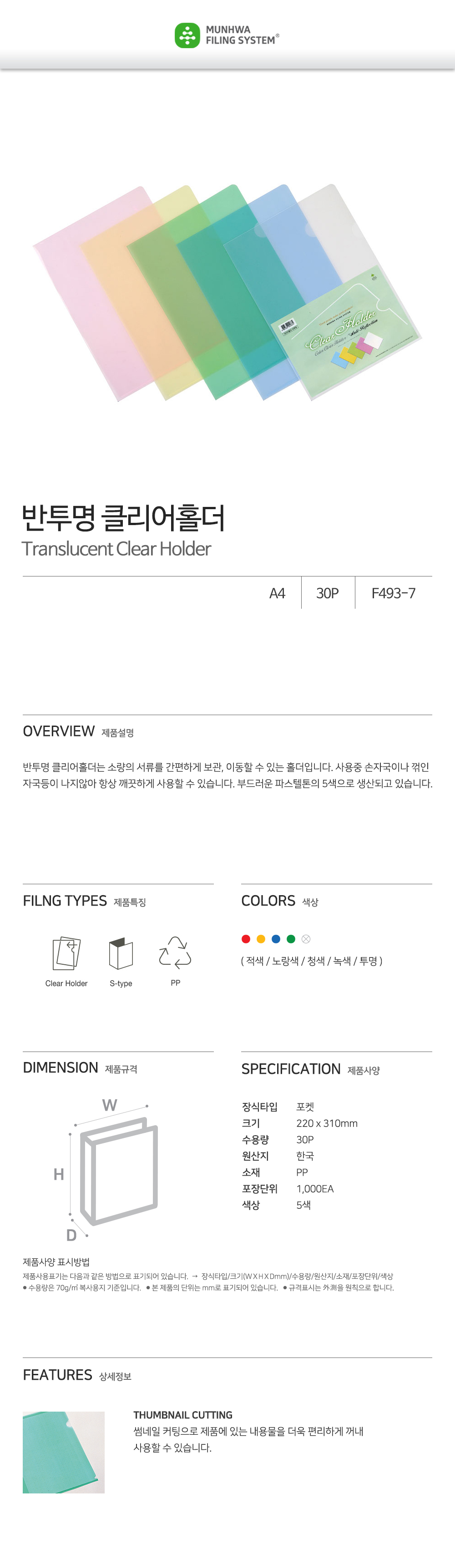 The Munhwa F493-7 is a premium semi-transparent L-holder designed for those who value both style and practicality. Unlike high-gloss folders, this model features a matte semi-transparent finish that effectively hides fingerprints, smudges, and minor creases, ensuring your folder always looks clean and professional. Available in a range of soft, pastel-inspired colors, it provides a sophisticated way to organize small document sets for meetings, classes, or personal projects.