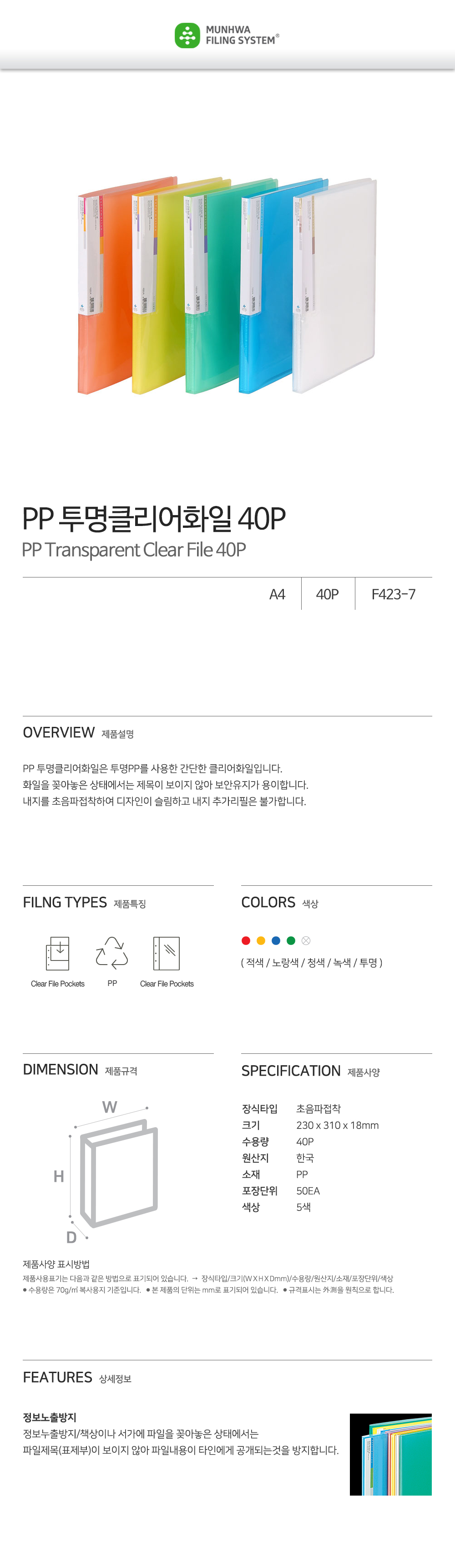 The Munhwa F423-7 is the high-capacity solution within the slim clear book series, specifically designed for extensive reports, project manuals, and academic archives. Crafted from premium transparent Polypropylene (PP), this 40-pocket file allows you to store a significant volume of documents in a single, organized unit. Its specialized design ensures that internal titles remain hidden when stored vertically, providing a professional look and an extra layer of privacy for your records in any workspace.