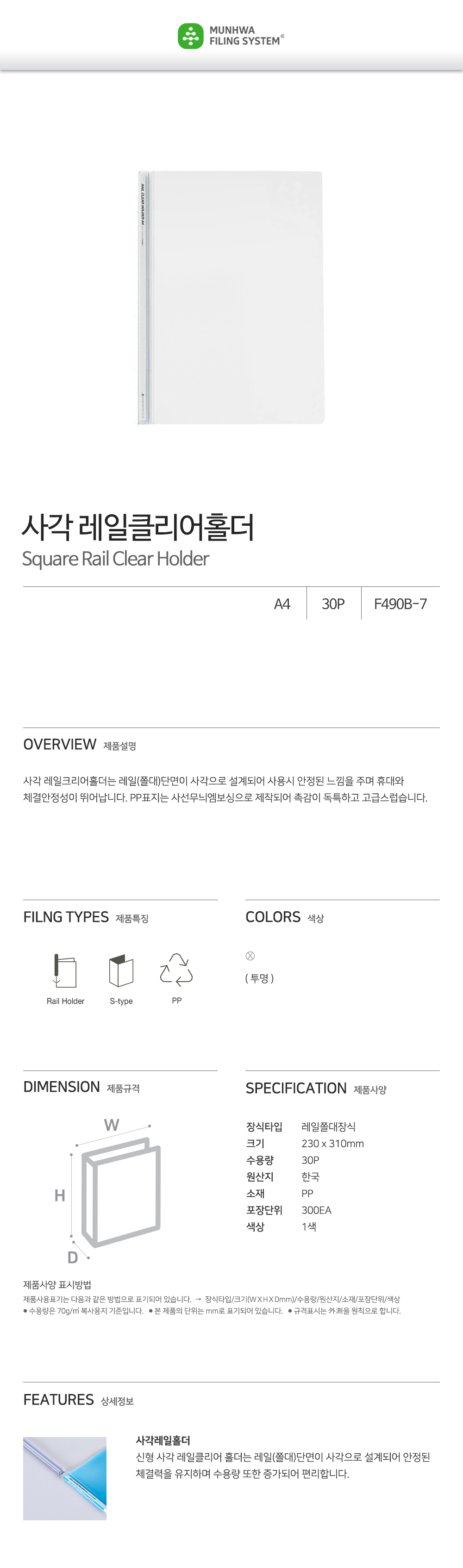 Munhwa Square-Rail Clear Holder F490B-7 | A4 Size | 10 Sheets per Pack | Diagonal Embossed Cover | Professional Slide Bar File | Made in Korea