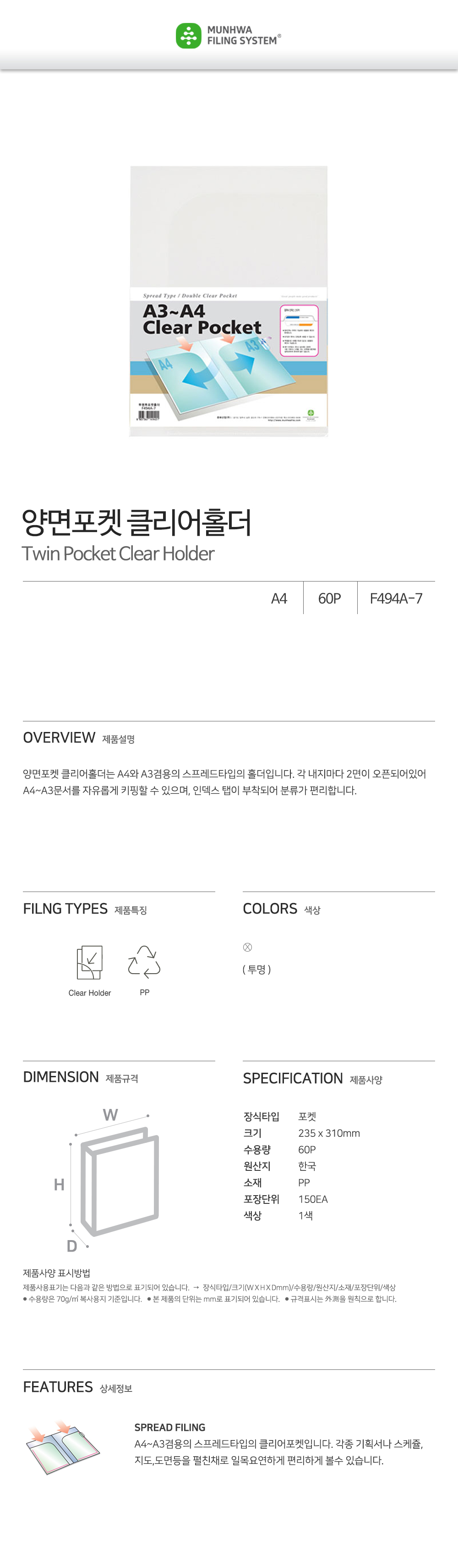 The Munhwa F494A-7 is an innovative spread-type holder designed for professionals who manage both A3 and A4 documents simultaneously. This twin-pocket folder functions as a seamless landscape display; when opened, it allows for the full-viewing of A3 blueprints, maps, or schedules across two pockets. When closed, it safely stores A4 sheets in a compact profile. Made from premium high-transparency Polypropylene (PP), it features an integrated index tab for effortless categorization, making it the perfect tool for project proposals, technical drawings, and complex itineraries.