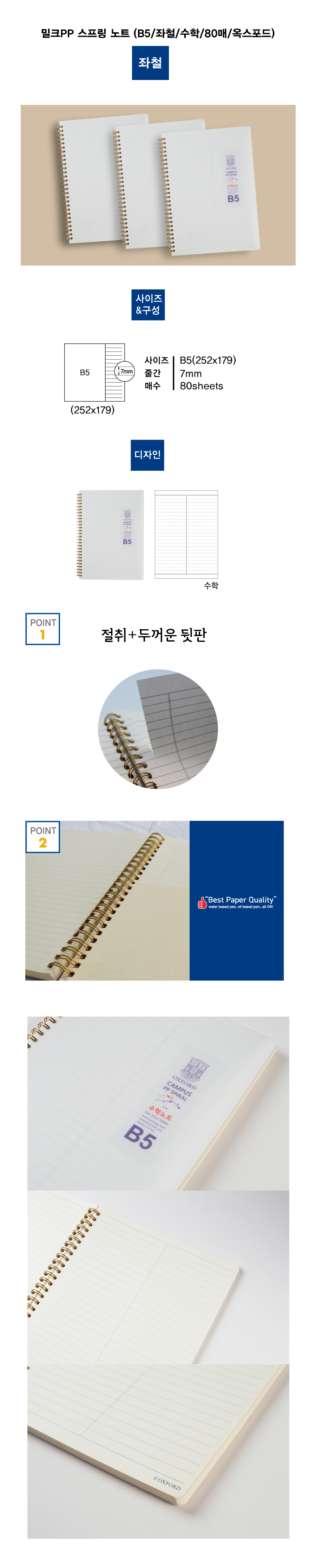 [Oxford] 4000 Milk PP Cover Perforated Spiral Notebook B5 Math Note | 7mm Lined / 80 Sheets | 252*179mm | Left Twin Spiral Bound | Made in Korea