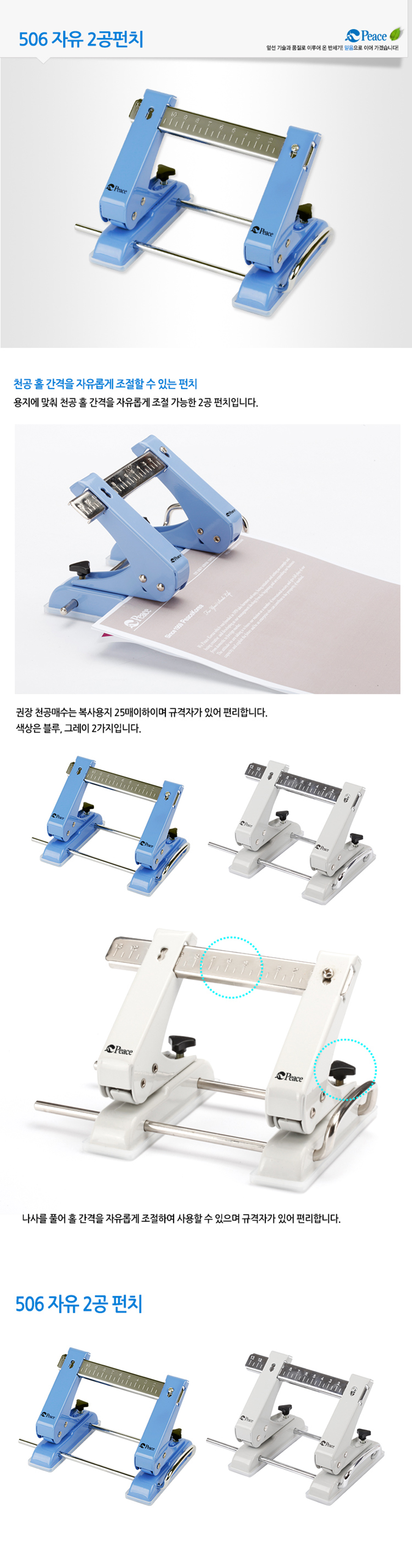 [PEACE] Adjustable 2-Hole Punch 506 | 25-Sheet Capacity | Flexible Hole Distance | Guide Ruler | Made in Korea