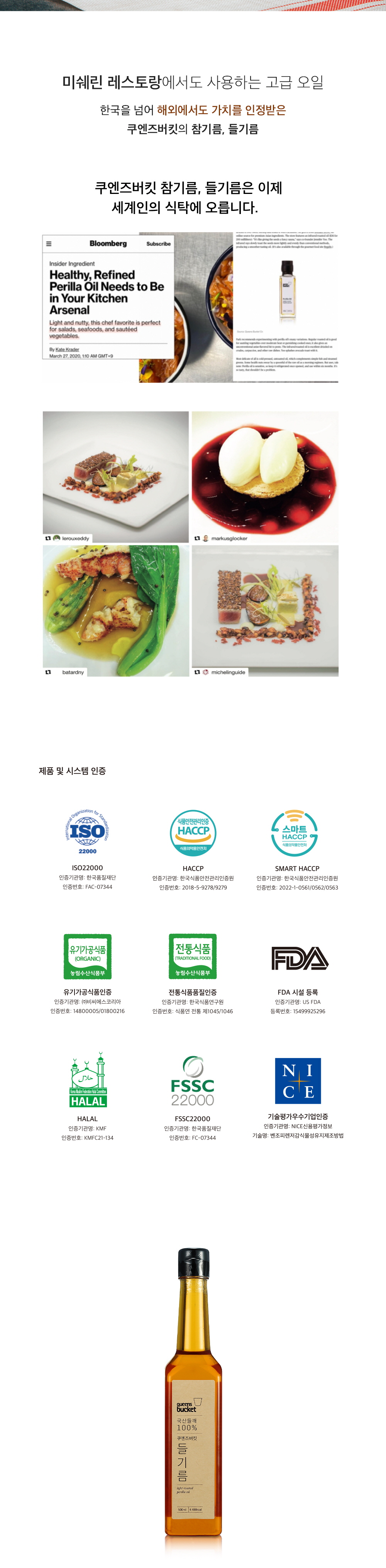 Queens Bucket Perilla Oil is a 100% Korean premium oil made with a cold-pressing method without roasting, preserving the natural mild and nutty flavor of perilla seeds.