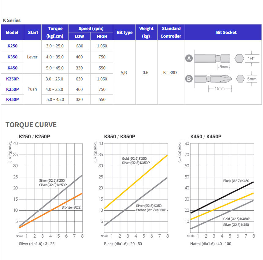 SAEHAN Clutch Control Electric Screwdriver K-SERIES, K250P, K350P, K450P, 330-630 RPM, 330-630 RPM, Push Type Electric driver