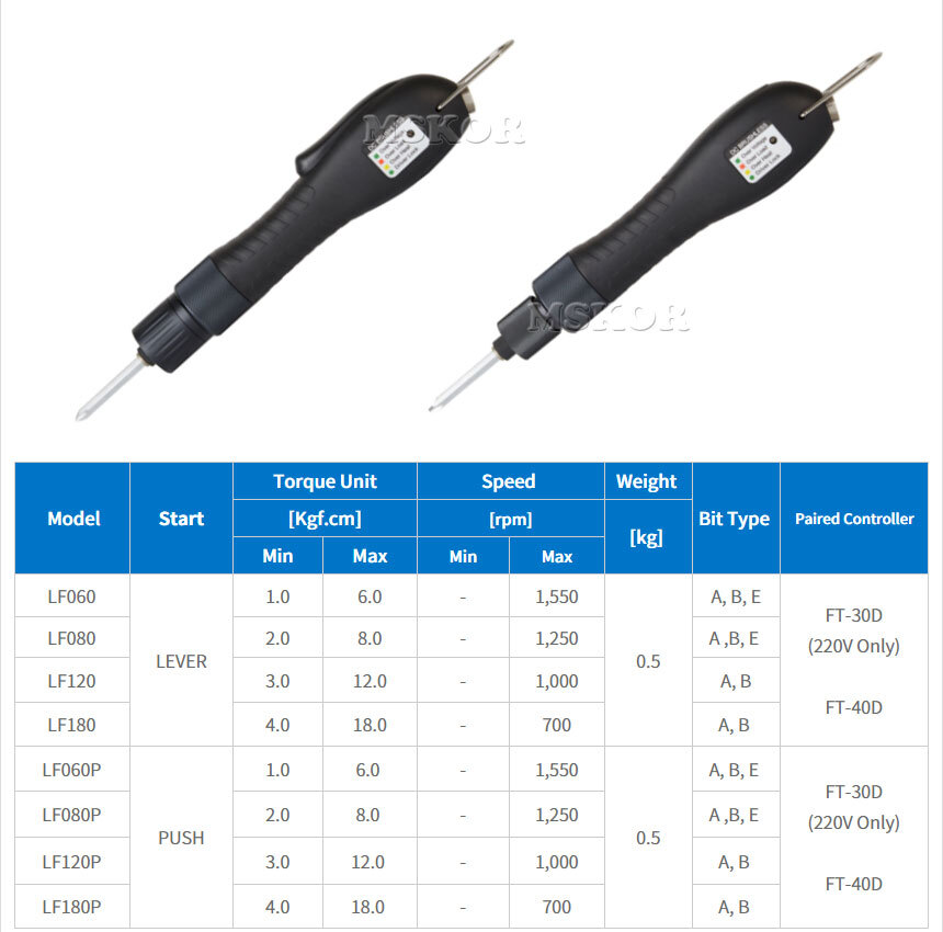 SAEHAN Clutch Control Electric Screwdriver LF-SERIES, LF060P, LF080P, LF120P, LF180P, Brushless Push type, Motor efficiency 80%, Low noise, Overheating, Overvoltage Protection Circuit Design
