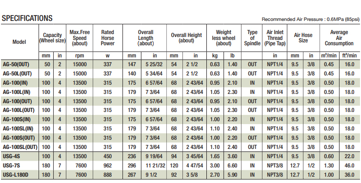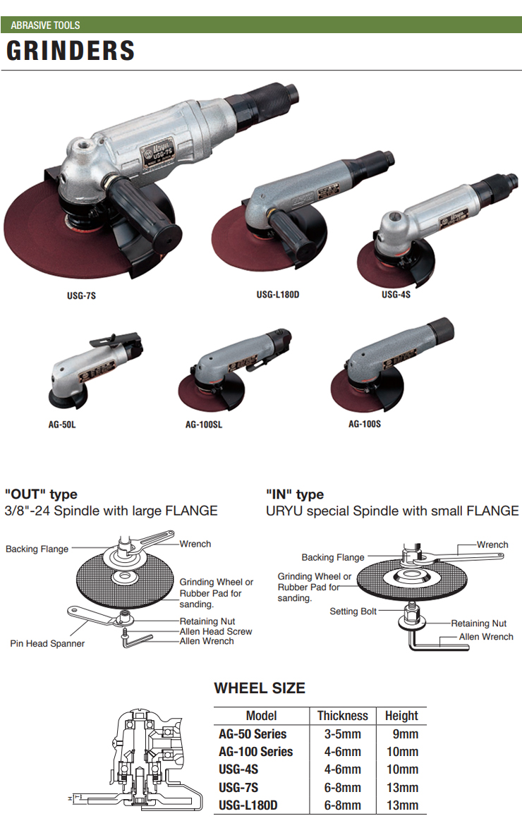 URYU AIR ANGLE GRINDER USG-7S, Wheel Size 180mm, 7600 rpm, 962w, Air Hose 12.7mm