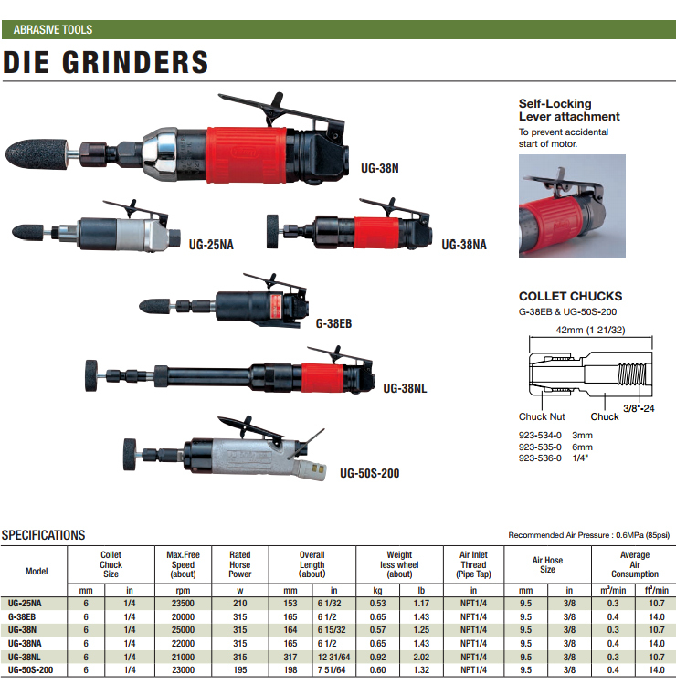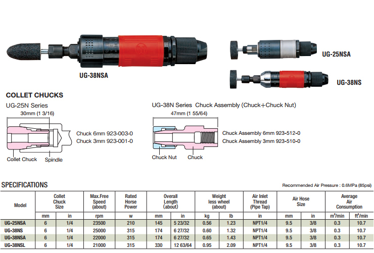URYU AIR DIE GRINDER UG-38EB, Collect Chunk Size 6mm, 20000 rpm, 315w, Air Hose 9.5mm