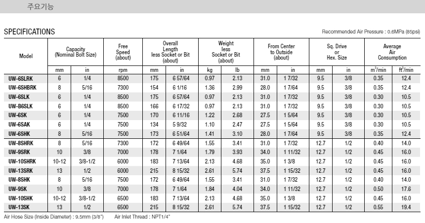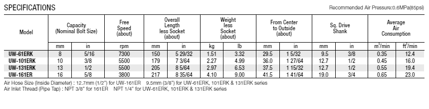 URYU IMPACT WRENCHES (PISTOL-TYPE) UW-6SHBRK, Bolt Size 8mm, 7300 RPM, Hex Size 9.5mm, Air Wrench