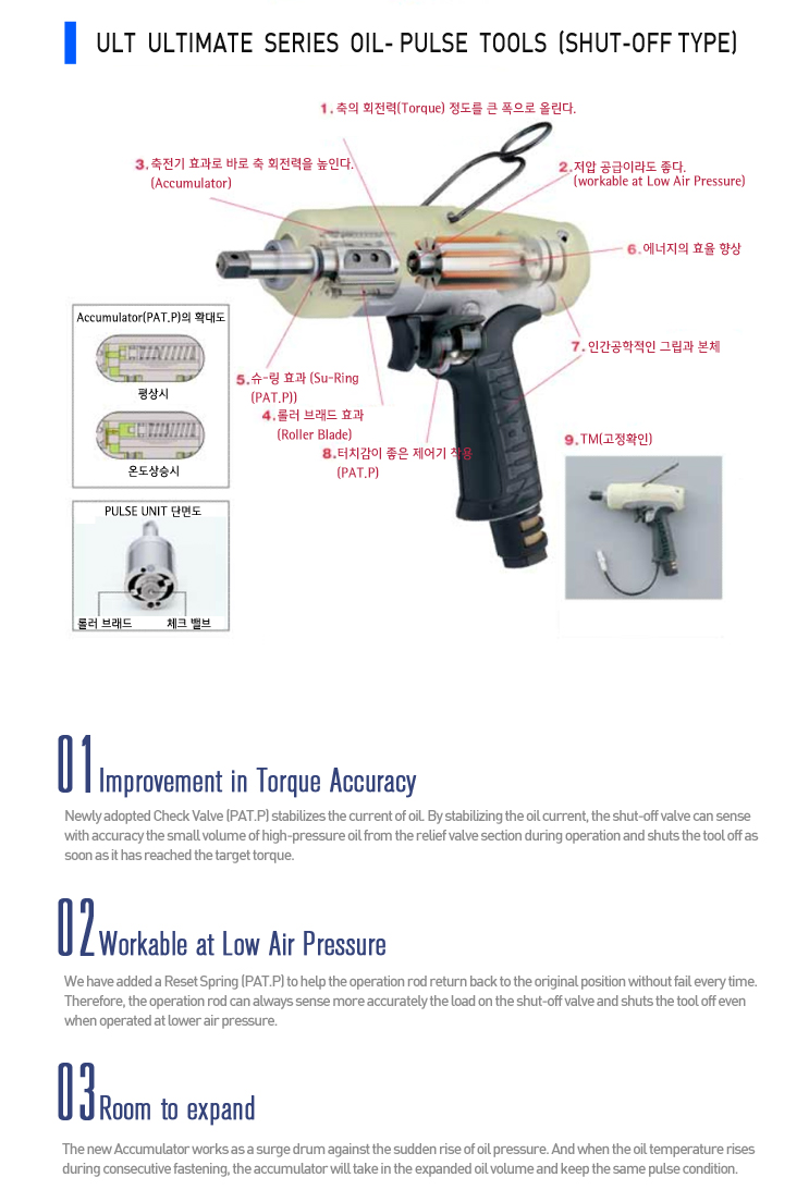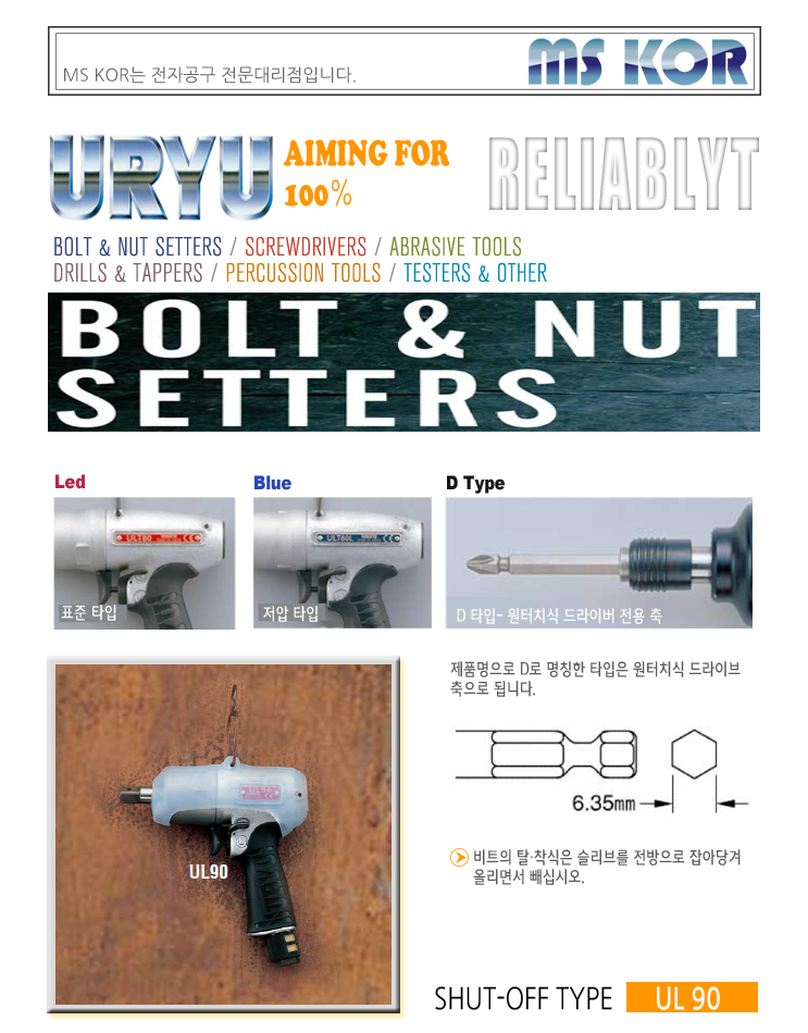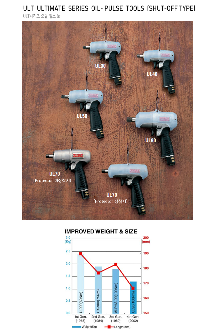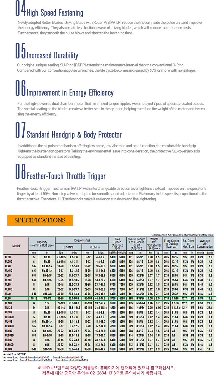 URYU OIL-PULSE Driver (SHUT-OFF, PISTOL-TYPE) UL90, Torque Range 55~90, 60.0~100Nm, Bolt Size 10~12mm, 5700~6000 RPM, Hex Size 12.7mm, Air Wrench, Screwdriver