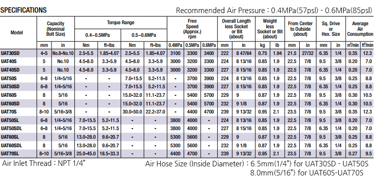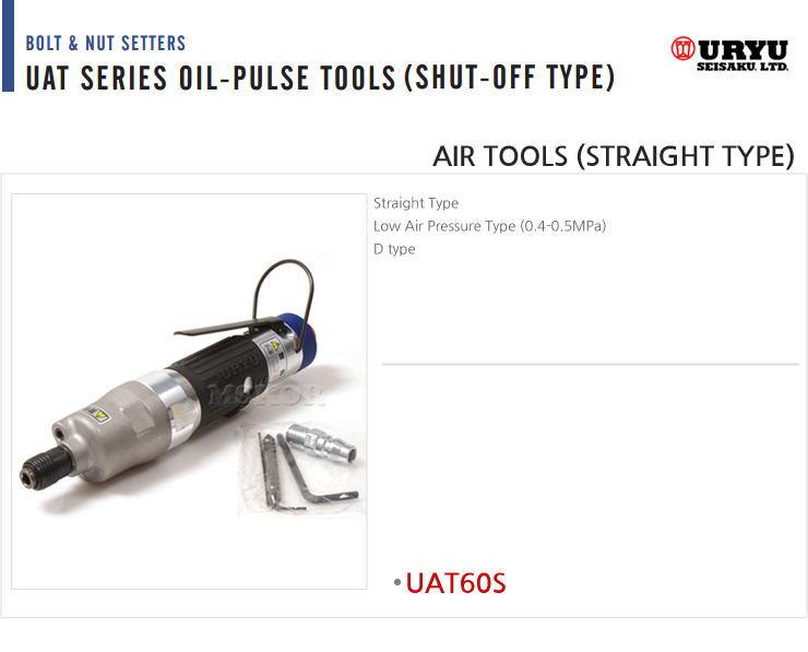 URYU OIL-PULSE TOOL (SHUT-OFF, Stright Type) UAT60S, Torque Range 15.0~32.50Nm, Bolt Size 8mm, 5400 RPM, Hex Size 9.5mm