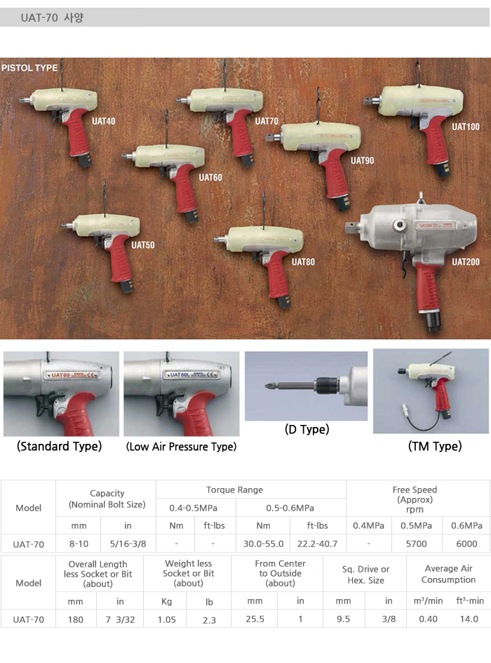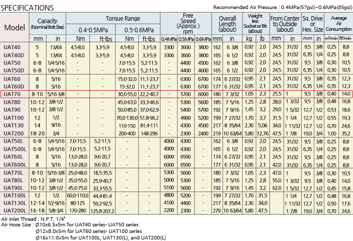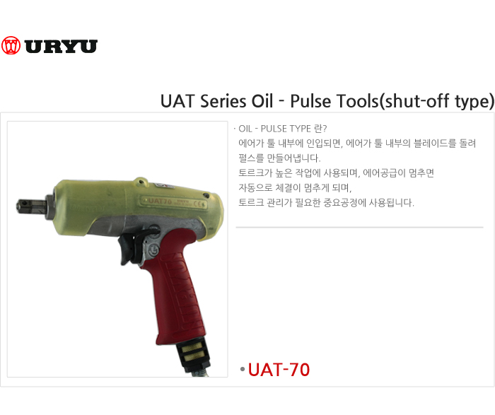 URYU OIL-PULSE TOOL (SHUT-OFF TYPE) UAT70, Torque Range 30.0~55.0Nm, Bolt Size 8~10mm, 5700~6000 RPM, Hex Size 9.5mm