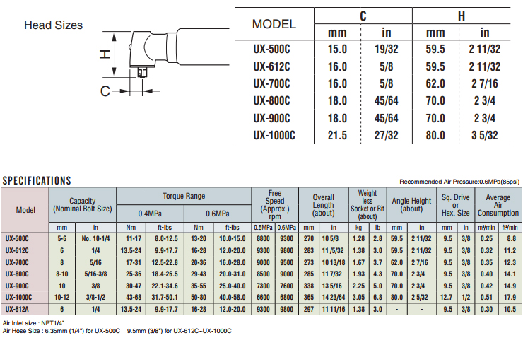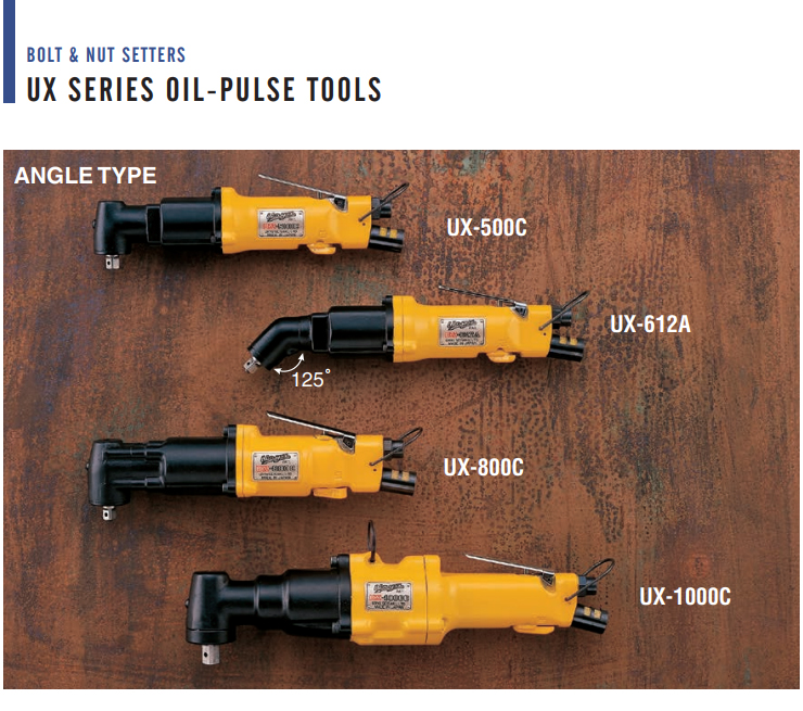 URYU OIL-PULSE Driver (ANGLE-TYPE) UX-500C, Torque Range 11~17, 13~20Nm, Bolt Size 5~6mm, 8800, 9300 RPM, Hex Size 9.5mm, Air Wrench