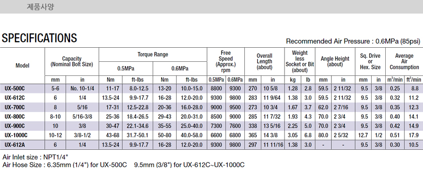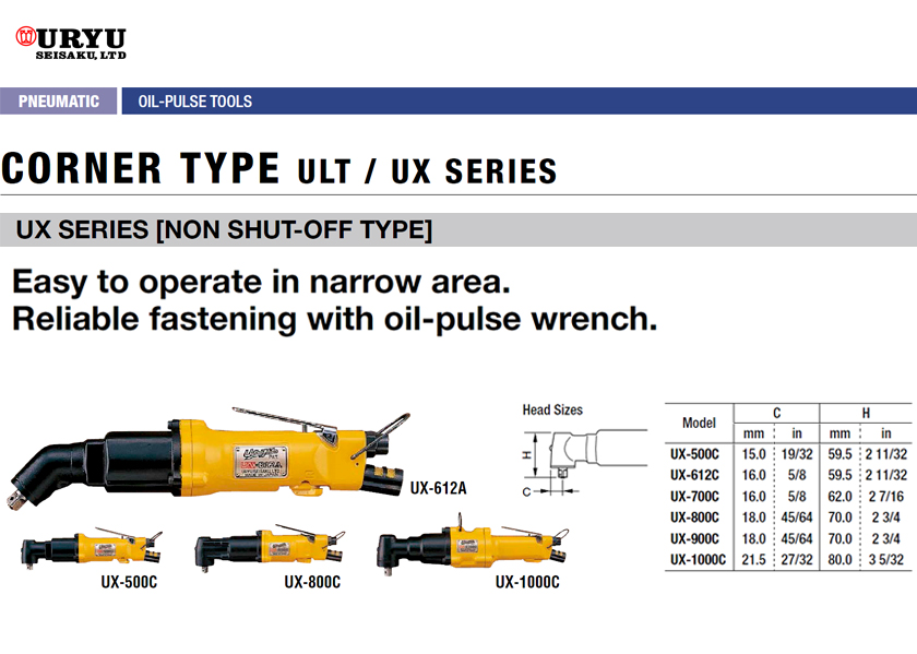 URYU OIL-PULSE Driver (ANGLE-TYPE) UX-612C, Torque Range 13.5~24, 16~28Nm, Bolt Size 6mm, 9300, 9800 RPM, Hex Size 9.5mm, Air Wrench