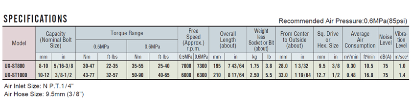 URYU OIL-PULSE Driver (PISTOL-TYPE) UX-ST1000, Torque Range 43~77, 50~90Nm, Bolt Size 10~12mm, 6000, 6300 RPM, Hex Size 12.7mm, Air Wrench