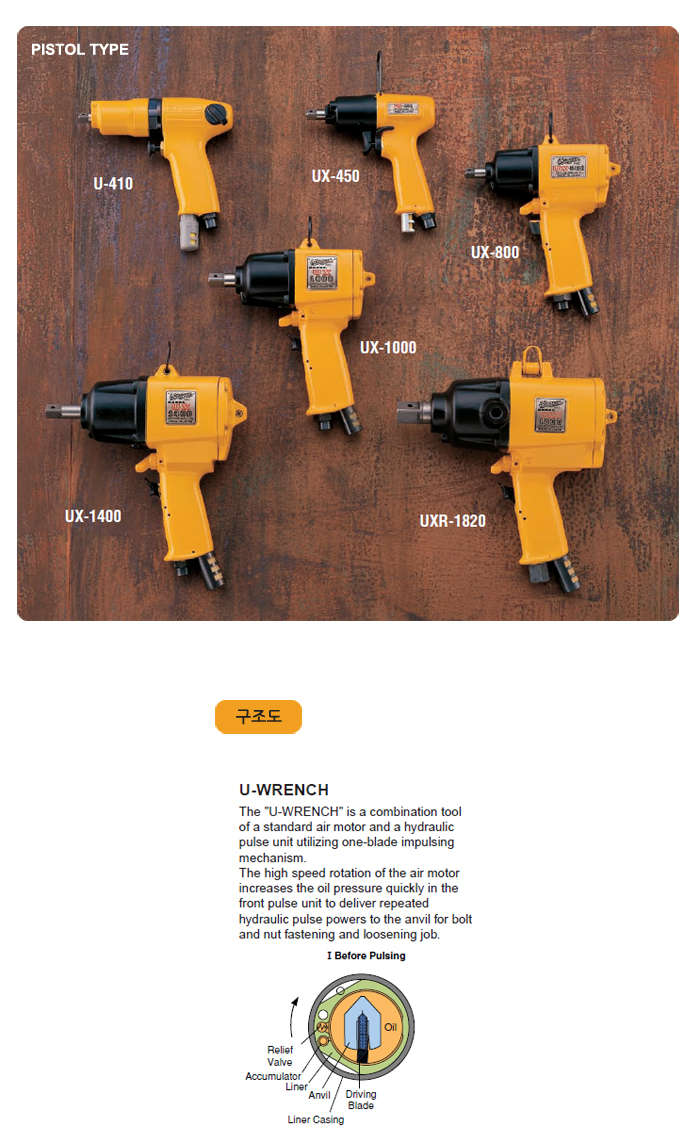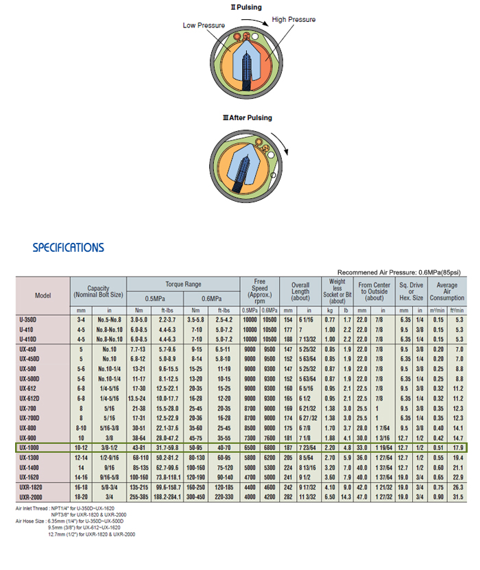URYU OIL-PULSE TOOL (PISTOL-TYPE) UX-1000, Torque Range 43~81, 50~95Nm, Bolt Size 10-12mm, 6500, 6800 RPM, Hex Size 12.7mm, Air Wrench, Screwdriver