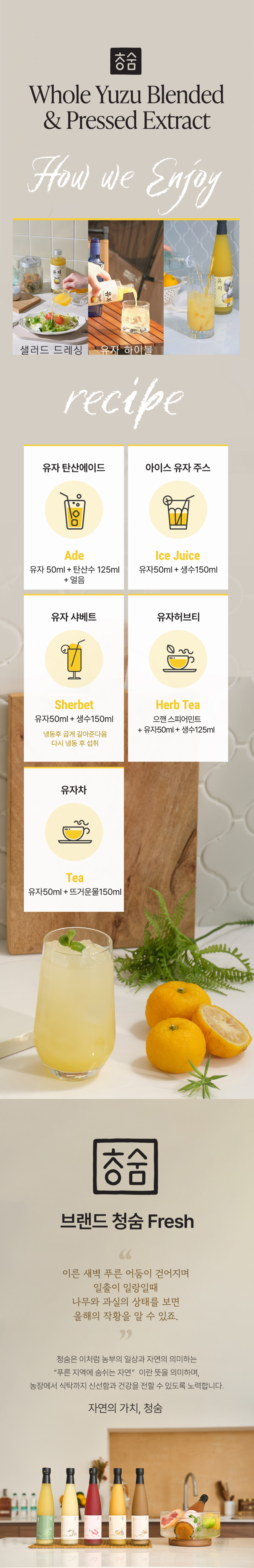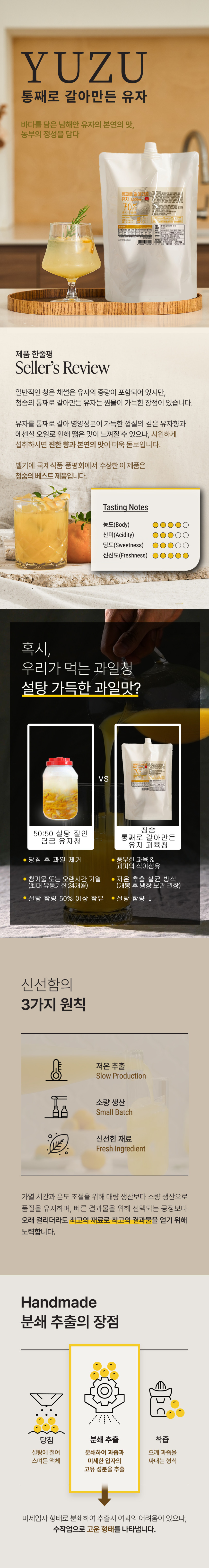 -The aroma of yuzu and yuzu oil, which is rich in nutrients from the whole yuzu kernel, may give it a little astringent, but if you eat it cold, the astringency will subside and it will be full of rich aroma and taste. In the case of yuzu, ordinary cheong is a weight that contains yuzu ingredients and yuzu liquid, but yuzu made from whole cheongsin has the advantage of being full of raw materials.