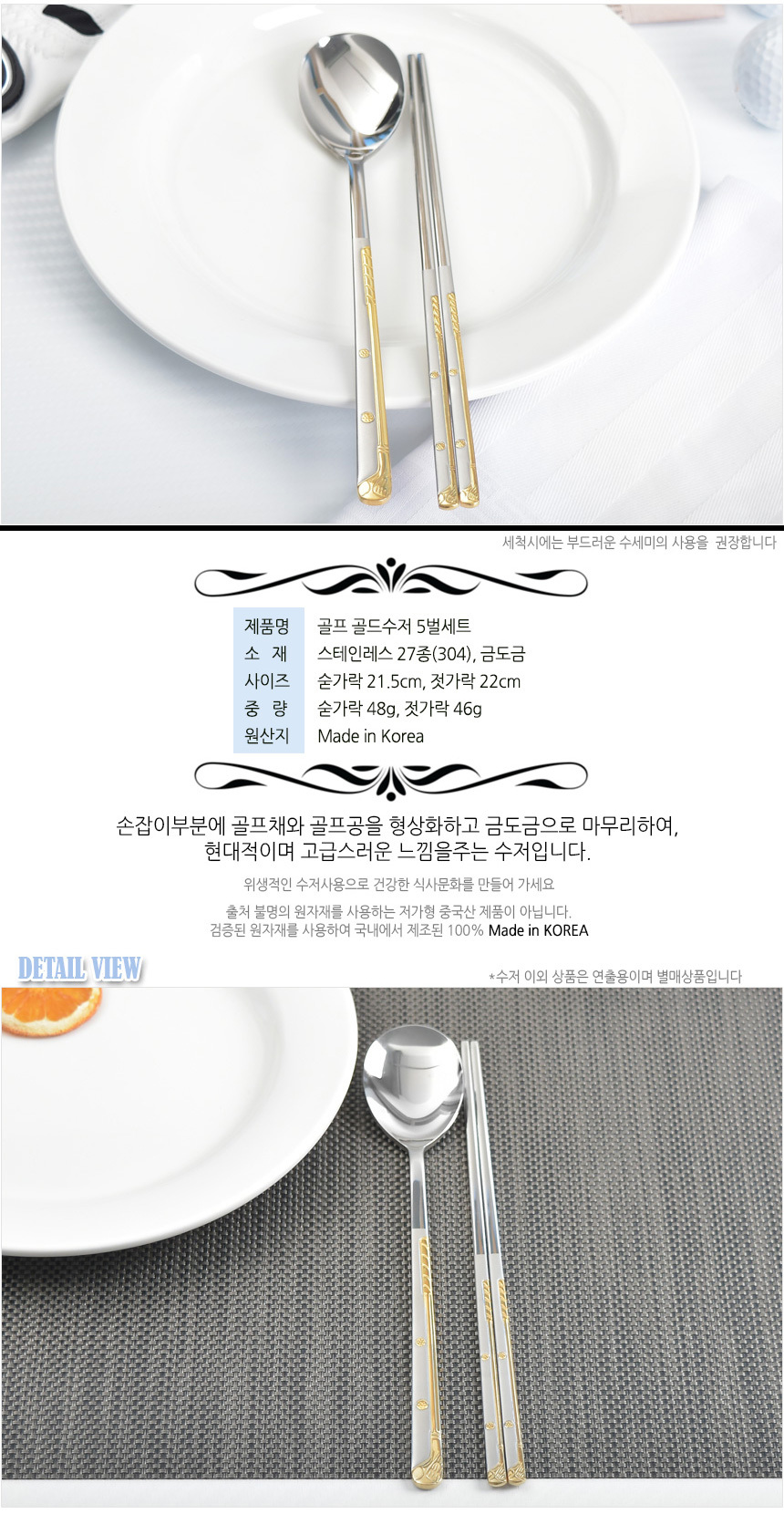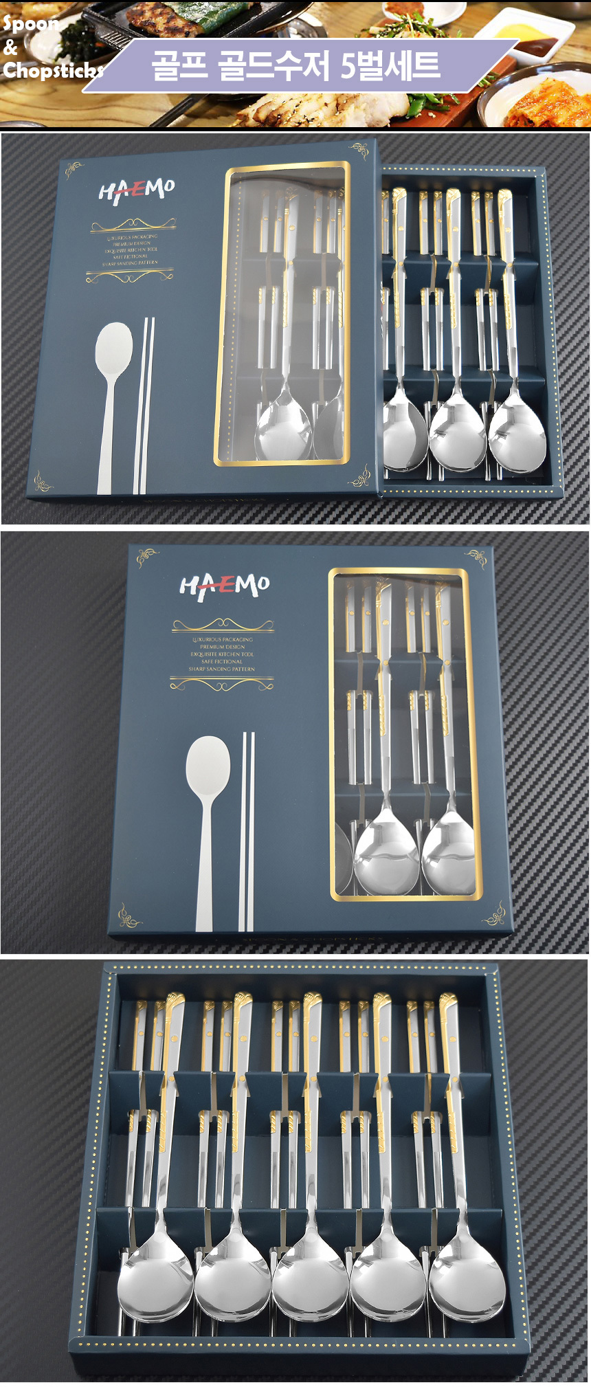 [HAEMO] Golf Gold Spoon Chopsticks, 5 Set (BK) _ Reusable Stainless Steel, Korean Chopstick Spoon, Tableware _ Made in KOREA