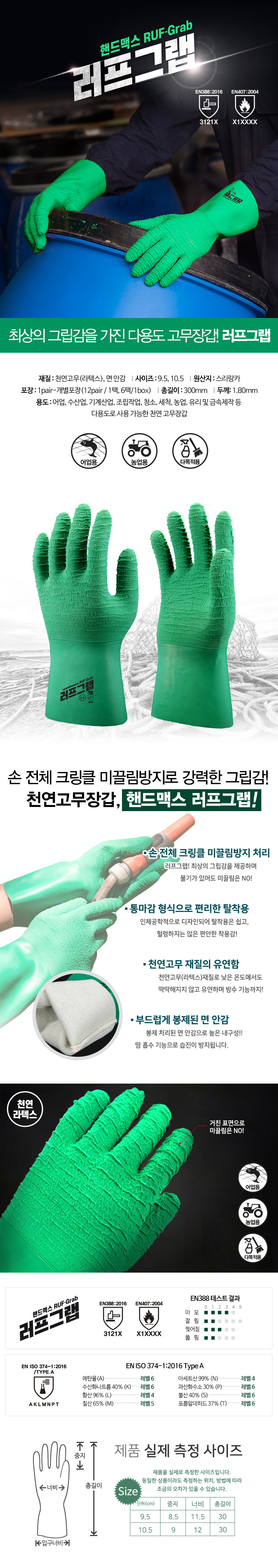 HANDMAX Rough Grab Multipurpose Rubber Gloves NO.311, natural rubber (latex), cotton lining, entire hand non-slip crinkle treatment, length 30cm, EN ISO 374-1:2016 Type A