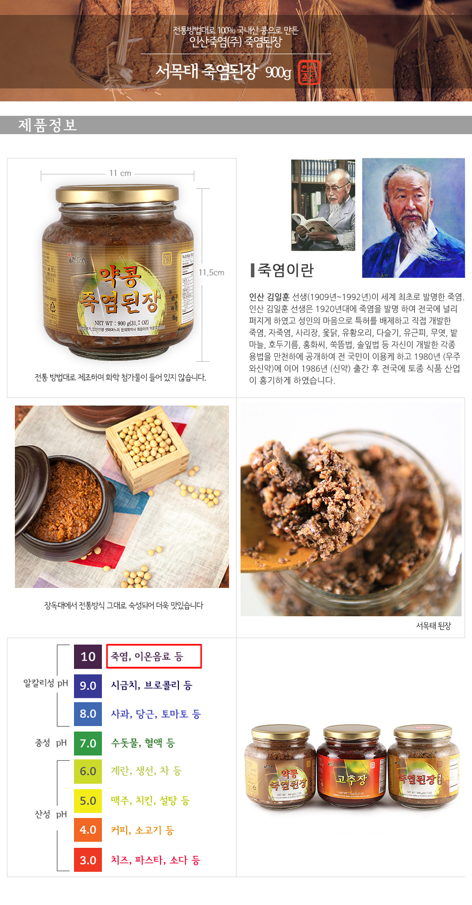 -It is a bamboo-salted miso made from Korean seomoktae (black beans, Seomoktae) that is boiled in a cast iron pot over a pine wood fire for over 6 hours, pounded, and then made into meju and soaked in the traditional way. It is a health food made from seomoktae, which is several times more nutritious than meju beans.