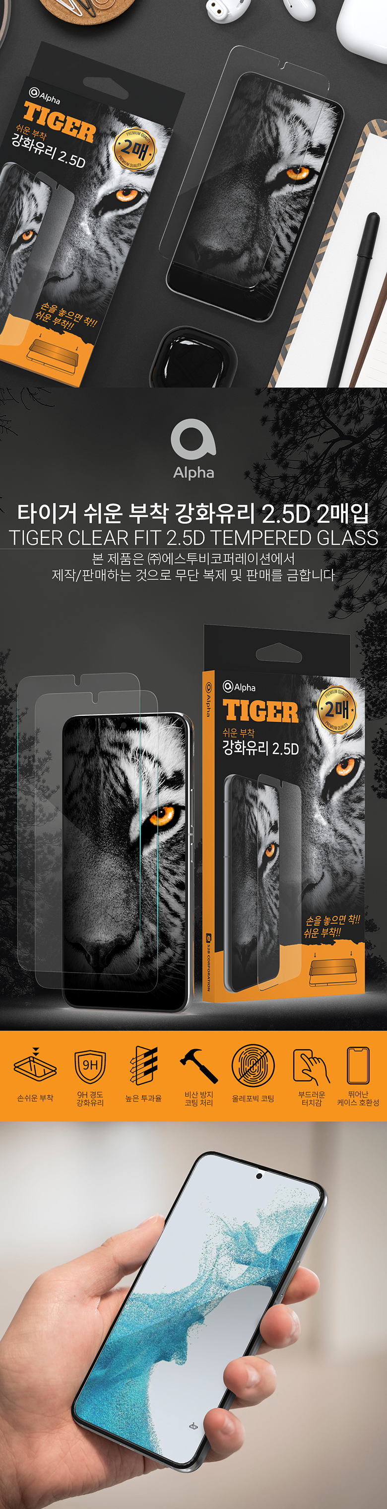 [S2B] ALPHA Tiger Clear Fit 2.5D Tempered Glass 2 sheets for Galaxy S21/S21+/S22/S22+/Xcover5, Made in Korea
