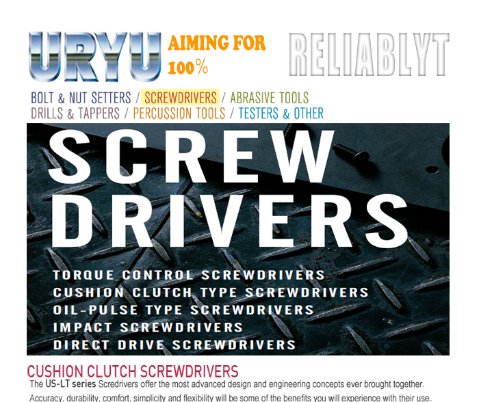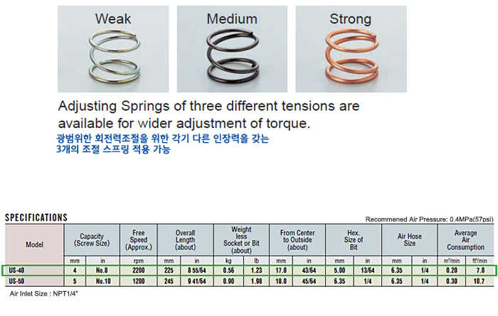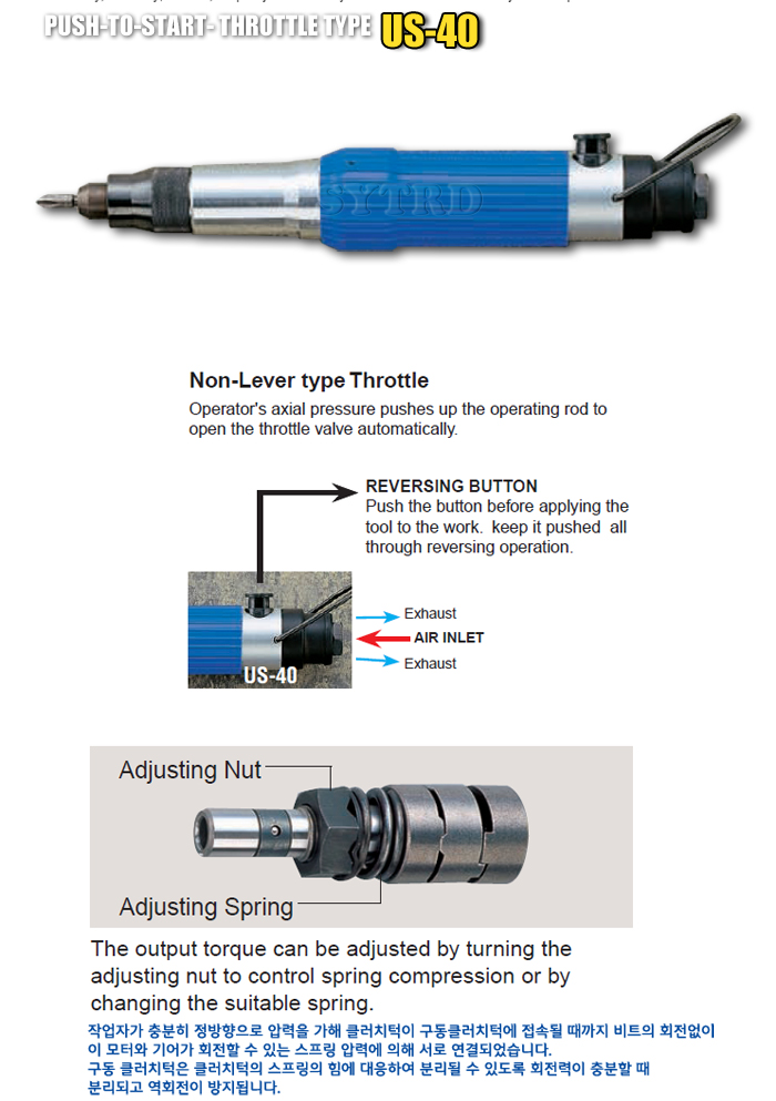 URYU CUSHION CLUTCH TYPE AIR SCREWDRIVER (STRAIGHT-TYPE) US-40, Screw 4mm, 22000 RPM, Air Hose 6.35mm, Hex 5.0mm