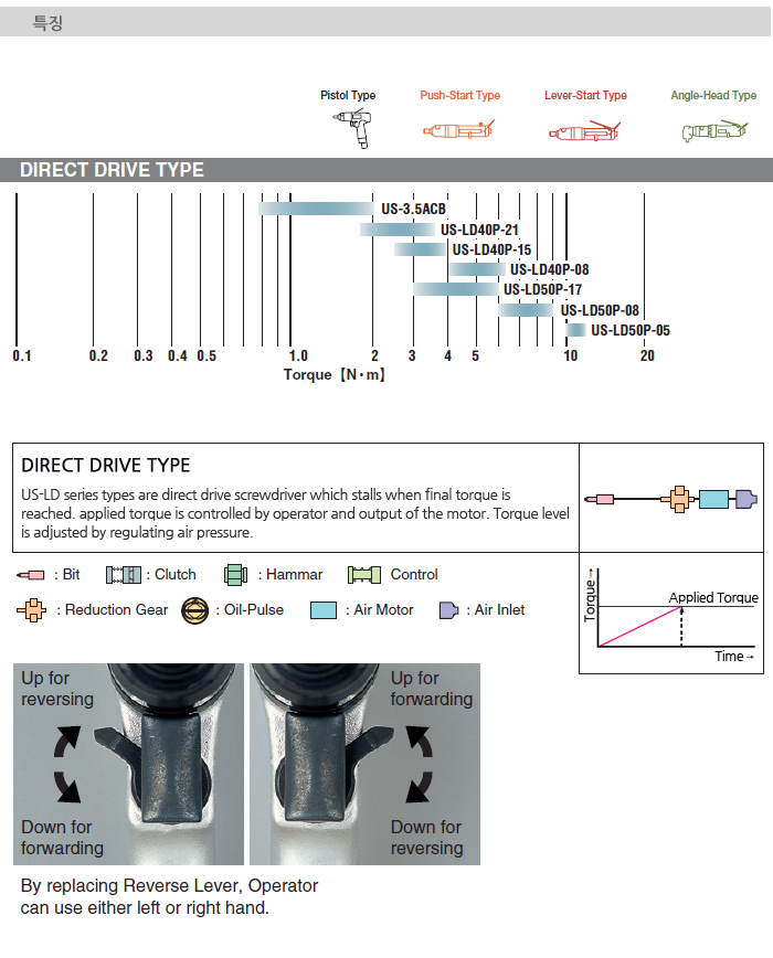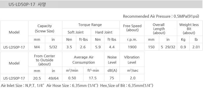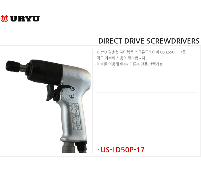 URYU DIRECT DRIVE AIR SCREWDRIVER (PISTOL-TYPE) US-LD50P-17, Screw 4mm, Torque 3.5, 5.9Nm, 1900 RPM, Air Hose 6.35mm, Hex 6.35mm