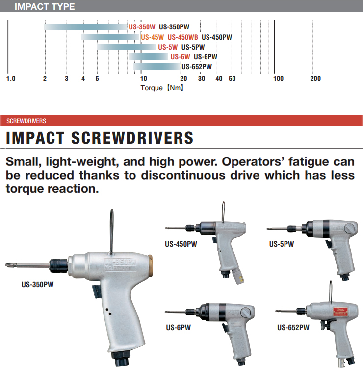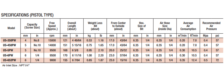 URYU IMPACT TYPE AIR SCREWDRIVER (PISTOL-TYPE) US-350PW, Screw 4mm, 15000 RPM, Air Hose 6.35mm, Hex 6.35mm