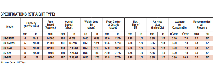 URYU IMPACT TYPE AIR SCREWDRIVER (STRAIGHT-TYPE) US-45W, Screw 5mm, 12000 RPM, Air Hose 6.35mm, Hex 6.35mm